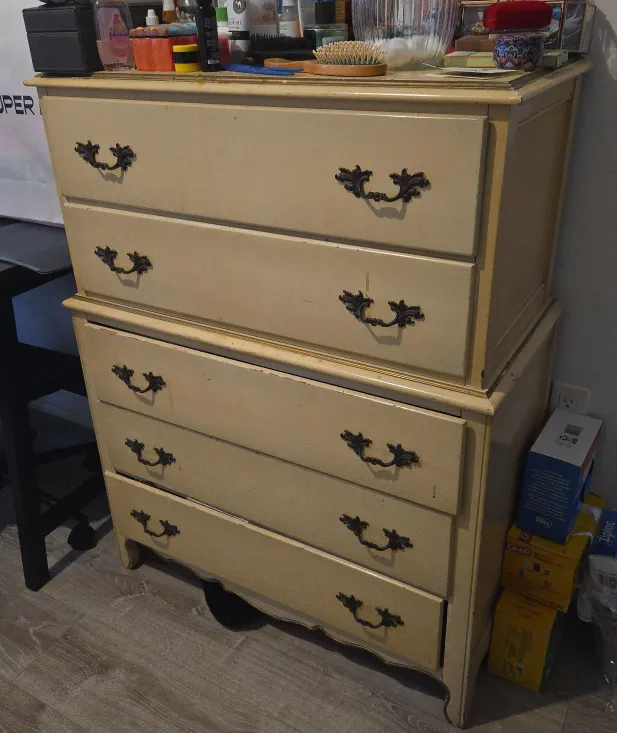 Selling a vintage dresser with a beige finish. It features ornate drawer pulls and a classic design. Perfect for adding a touch of old-world charm to any bedroom or living space. It has some signs of wear and tear, adding to its character!