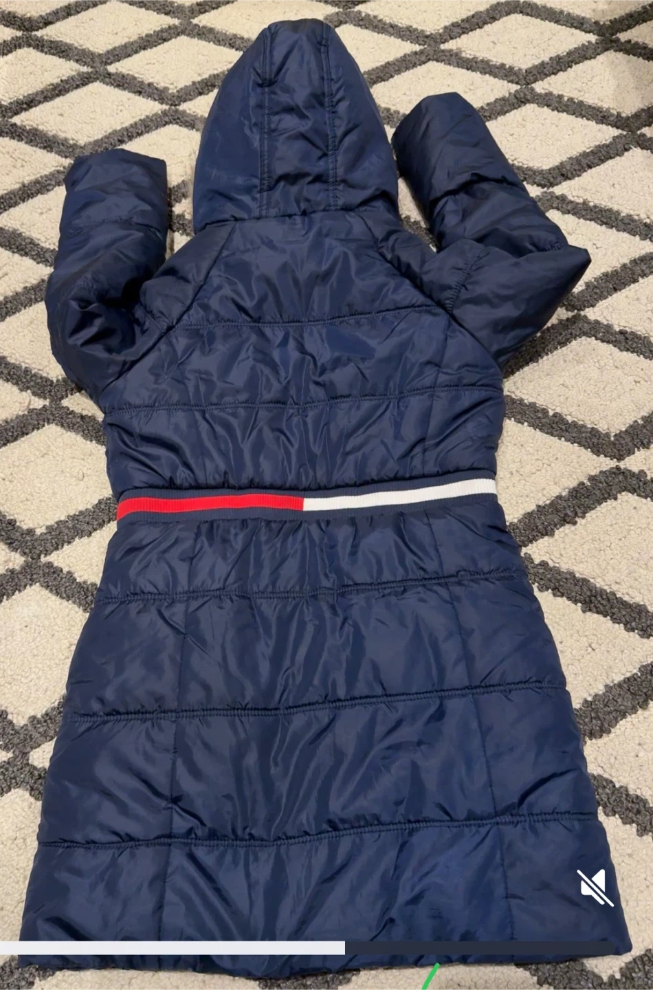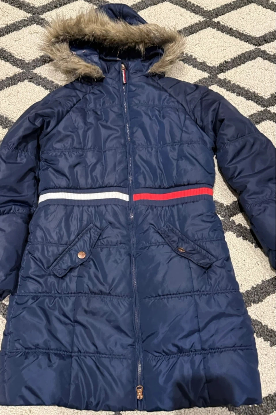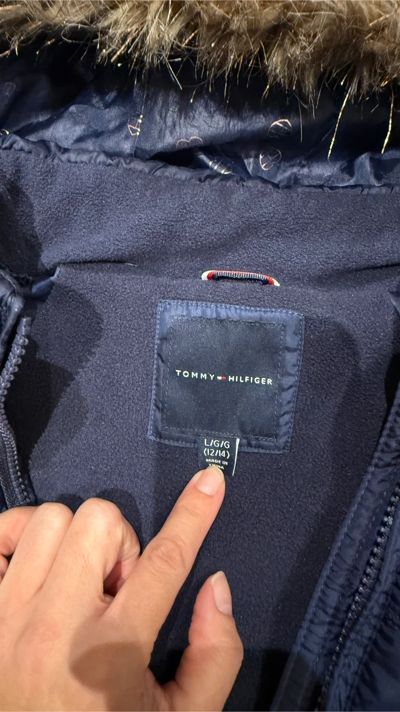 60Tommy Hilfiger girls' puffer coat in size Large (12/14). The coat is navy blue and features a faux fur-trimmed hood and a heart-shaped sequin patch on the sleeve. It also has the signature Tommy Hilfiger stripe around the waist. Perfect for keeping your little one warm and stylish!