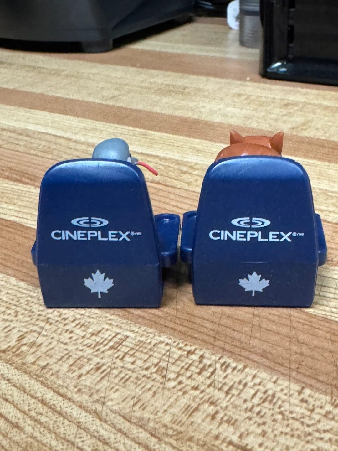 Two adorable Cineplex collectible figures up for grabs! One is a cute duck and the other is a charming squirrel, both seated in little blue chairs. Perfect for Cineplex fans or anyone who loves collecting unique items!