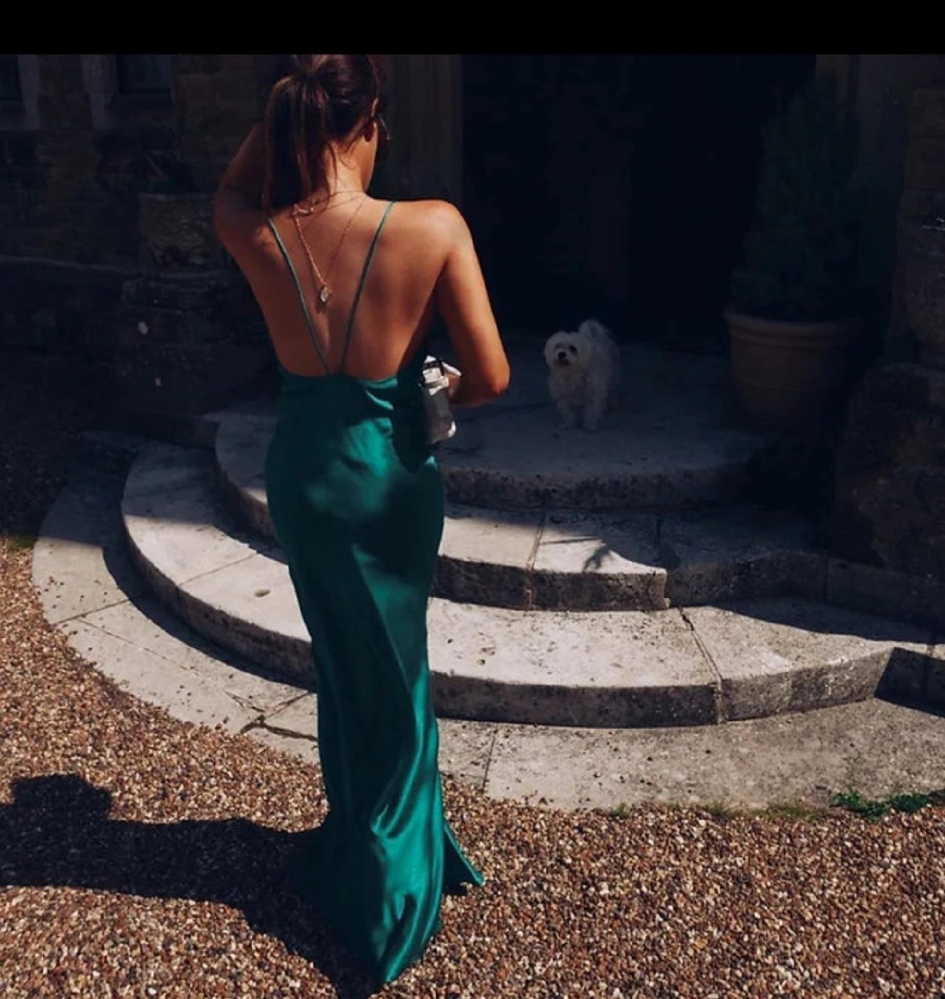 Selling a beautiful green satin slip dress. It's in great condition and perfect for a night out or special occasion. The material is smooth and feels luxurious! It would look great with heels or sandals!