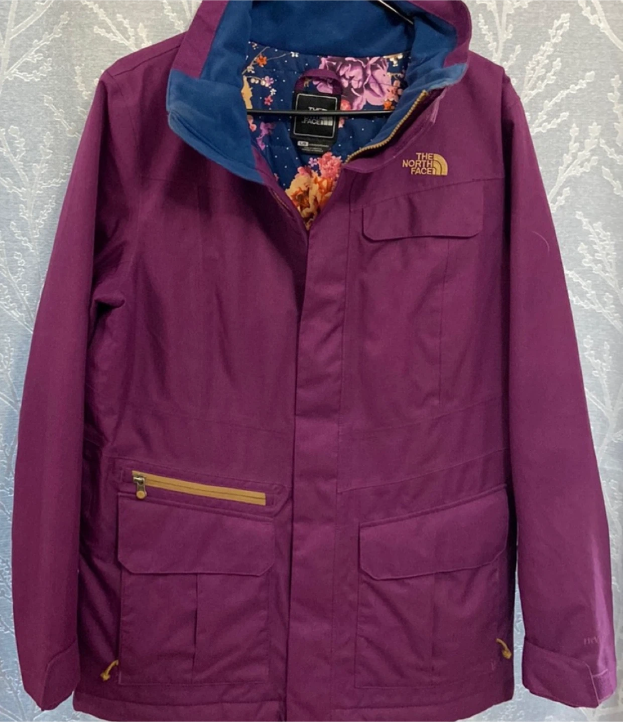 Cute North Face jacket in purple! It's a women's size medium. The inside has a floral pattern. It's in great condition, can be worn as is or layered for colder temperatures.