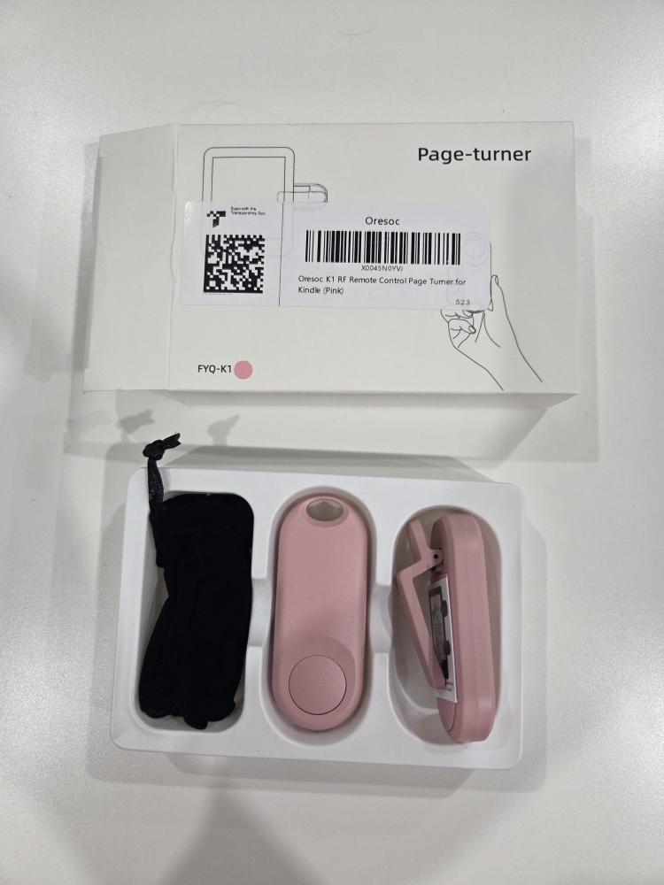Selling an Oresoc K1 RF remote control page turners for Kindles in pink. They come in their original box with all components included. This handy device makes reading on your Kindle even easier!