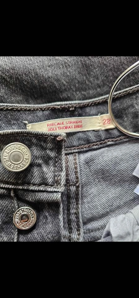 Levis Ribcage Straight ankle length ultra high rise jeans, in a washed black/ dark grey shade. Jeans are slim through the hip and thigh, and have a button fly closure. Classic 5 pocket design and super high waist for a flattering fit. Jeans are made of 99% cotton and 1% elastane, for a bit of stretch.