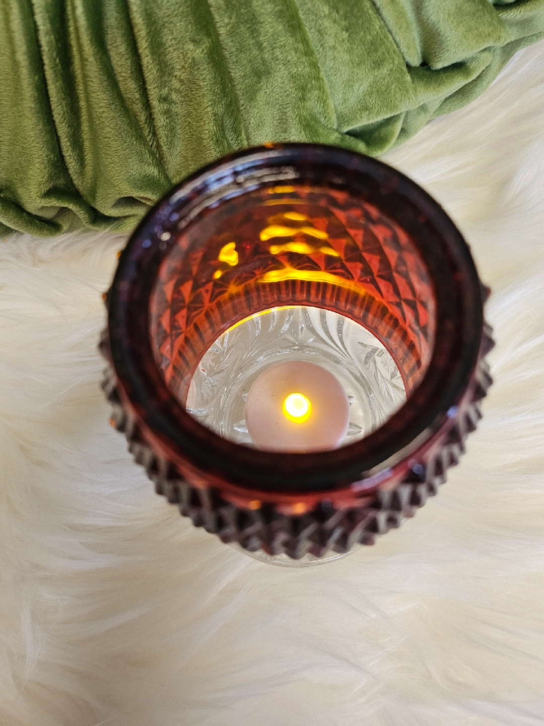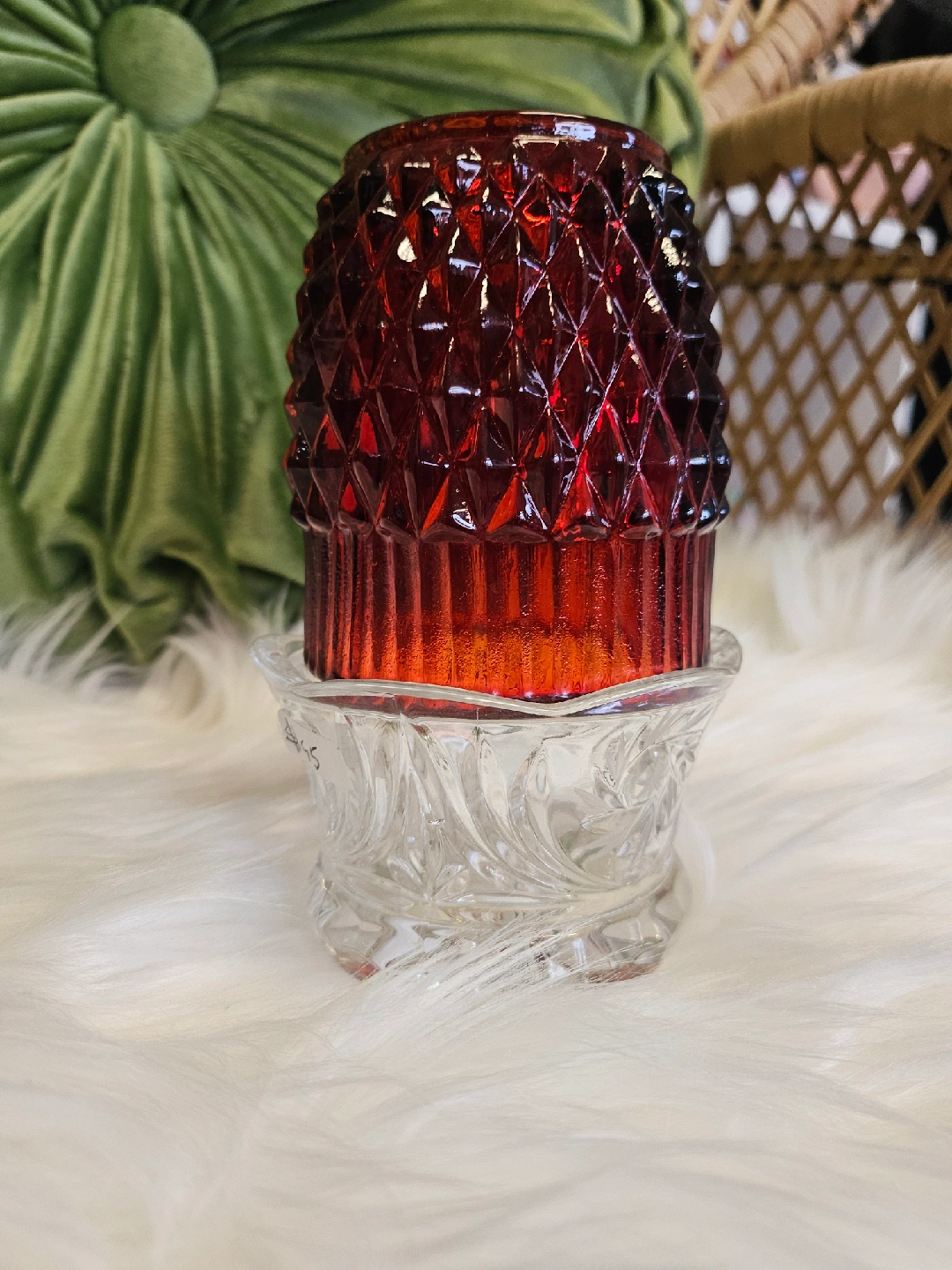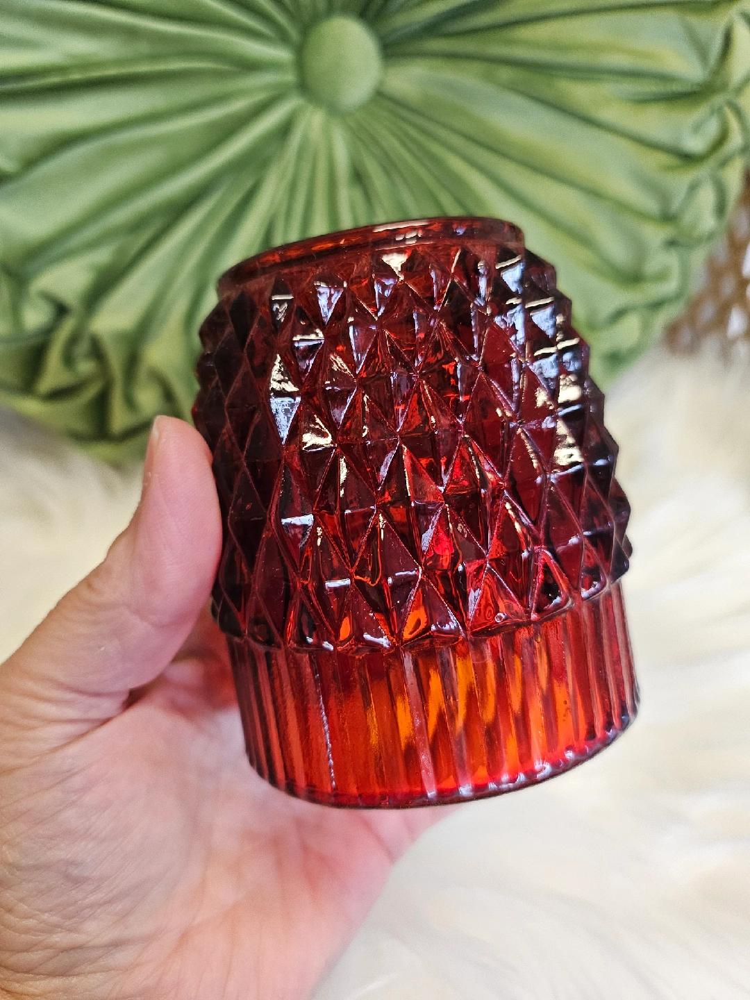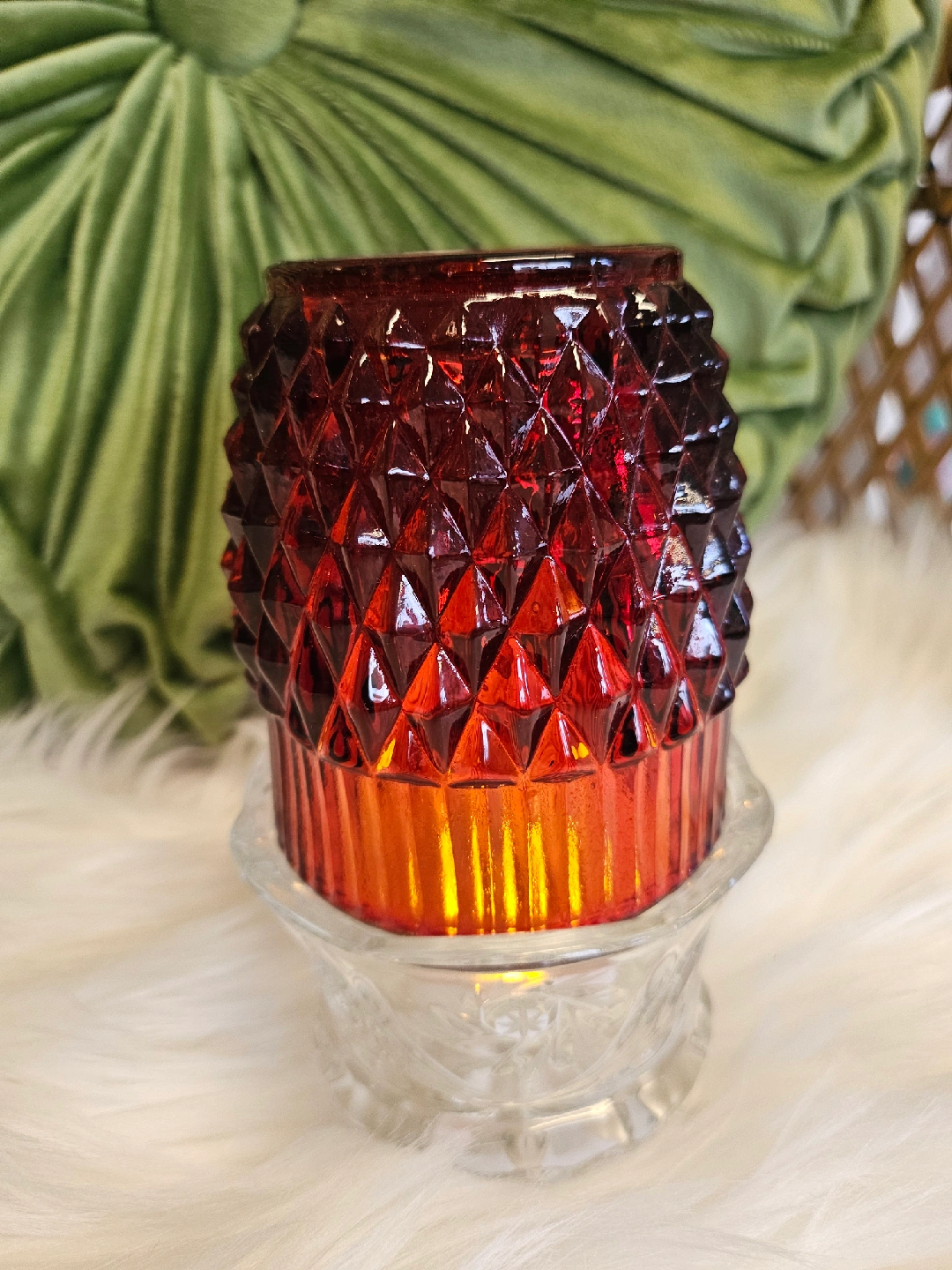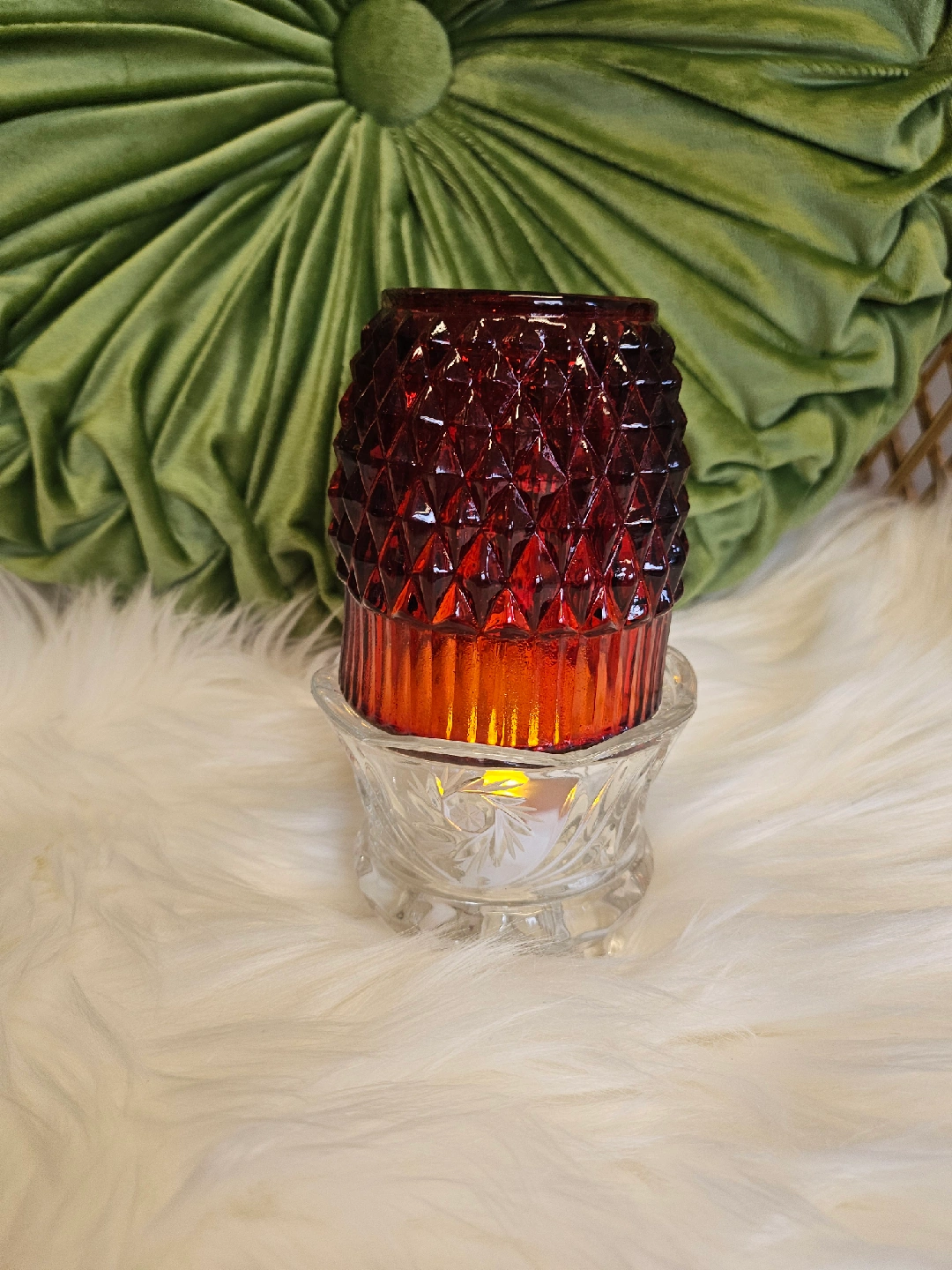 21A pretty red fairy lamp glass candle holder with a diamond pattern on top and a clear glass base. Perfect for adding a touch of warmth to any room!