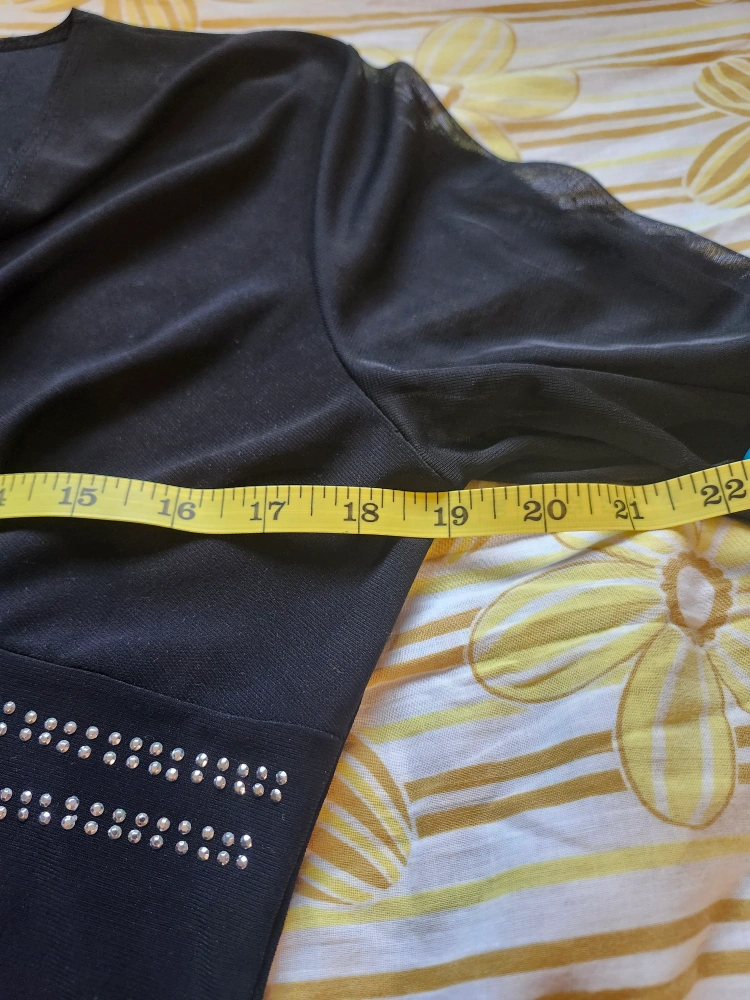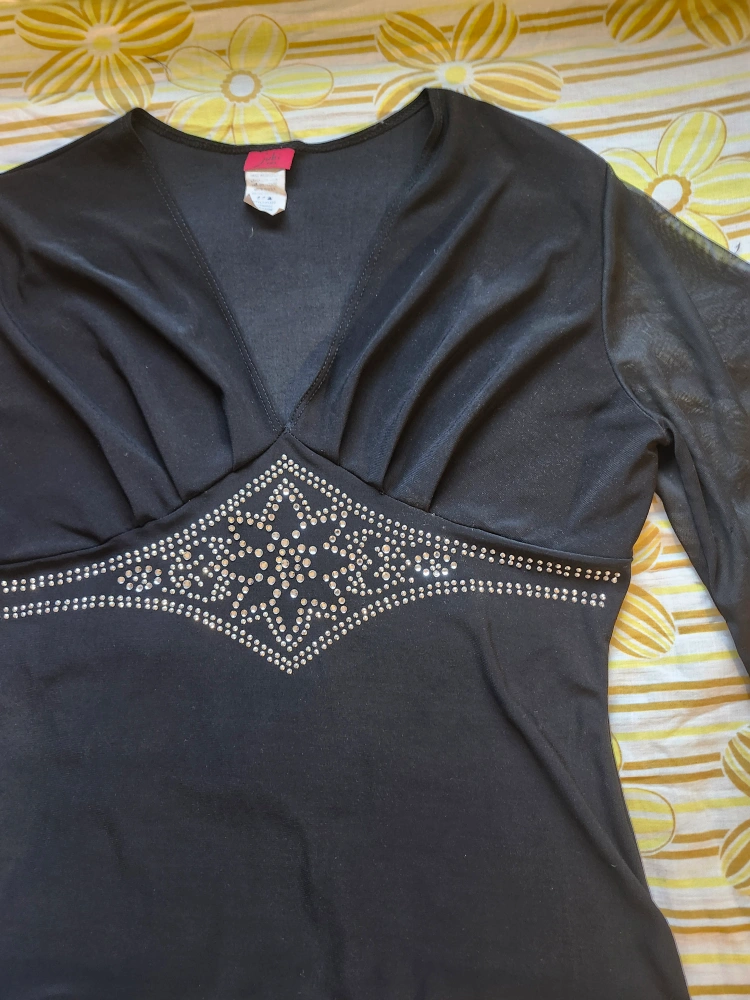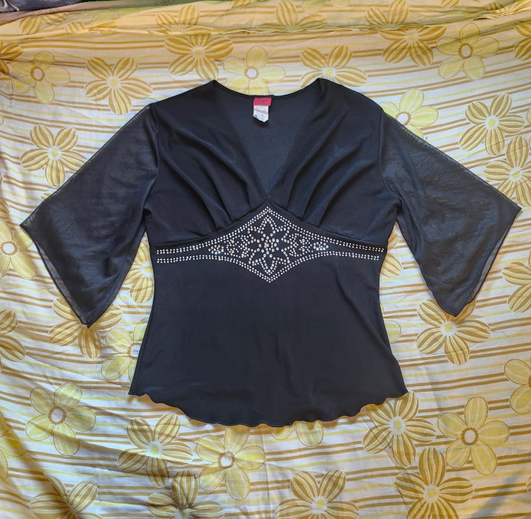 75adorable y2k black babydoll top! has flowly 3/4 length sleeves and rhinestones on the front. by the brand Jubi. label size L, pit to pit laying flat is 19in, tightest point of the waist (with some stretch) is just under 15in item is in good used condition with no flaws or stains that I could notice