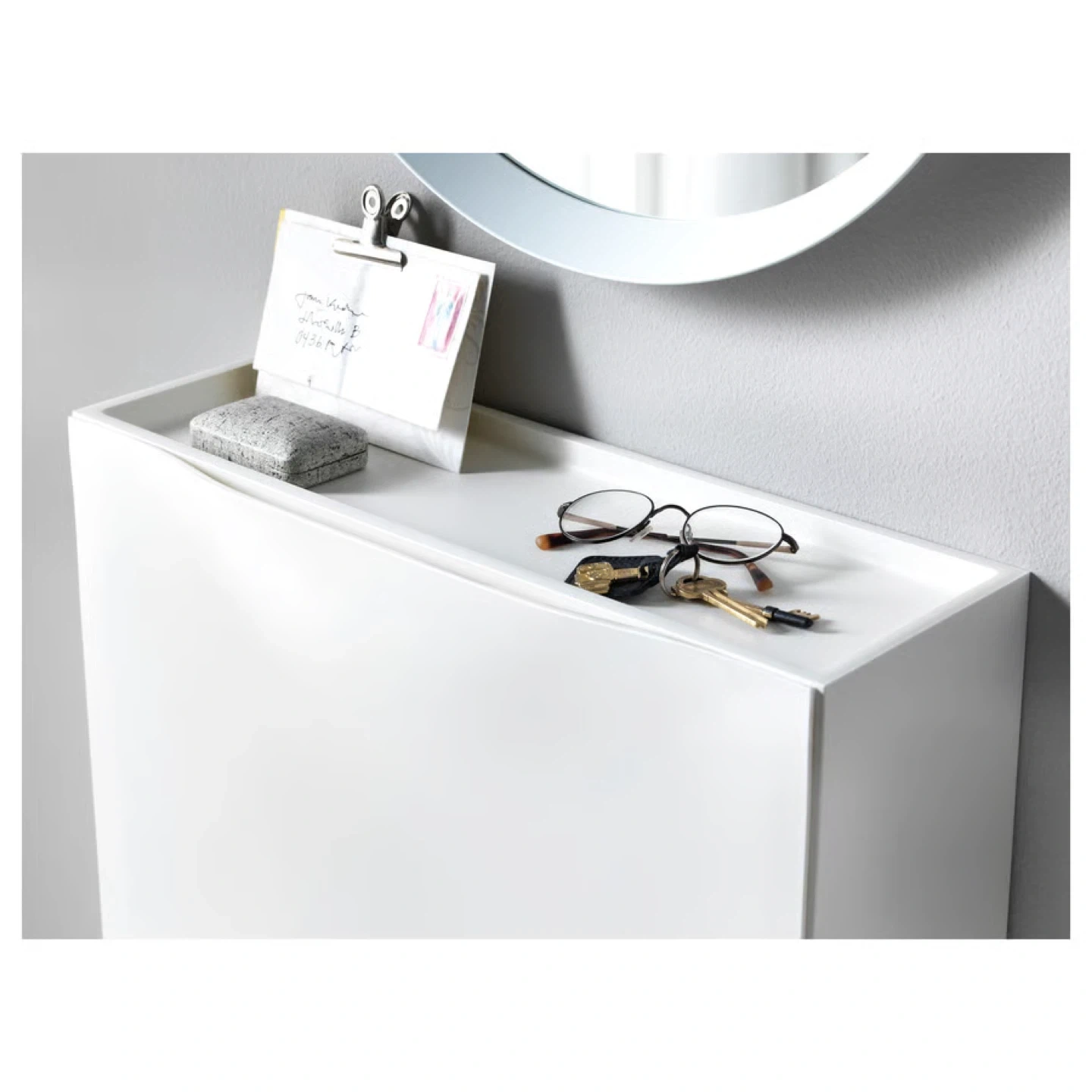 Selling one white IKEA TRONES shoe cabinet. It's in great condition and ready to organize your entryway! It’s stackable and helps you keep your shoes organized with tray space on top and makes your space look tidy. Perfect for small spaces and easy to mount on the wall with command strips!