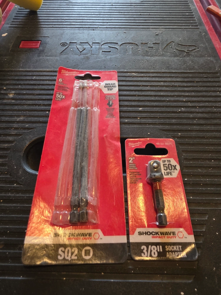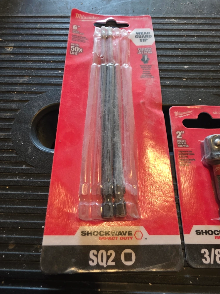 59I'm selling a Milwaukee Shockwave Impact Duty SQ2 and a 3/8" Socket Adapter. Both are designed for up to 50x life. The SQ2 is 6" long and features a wear guard tip for increased bit life!