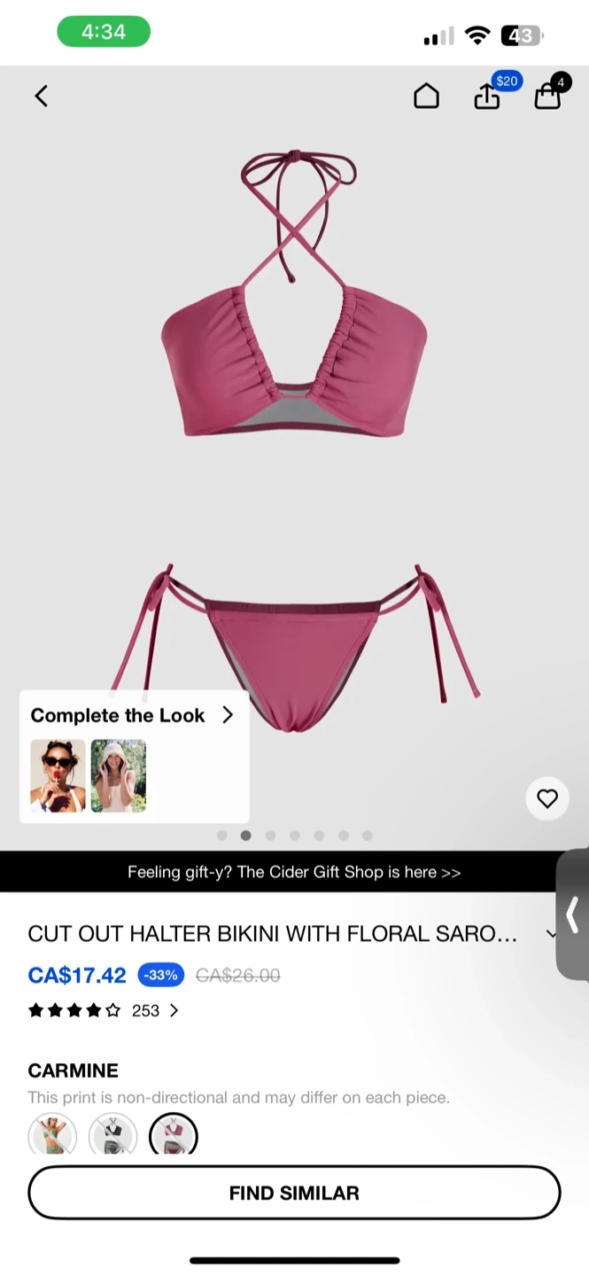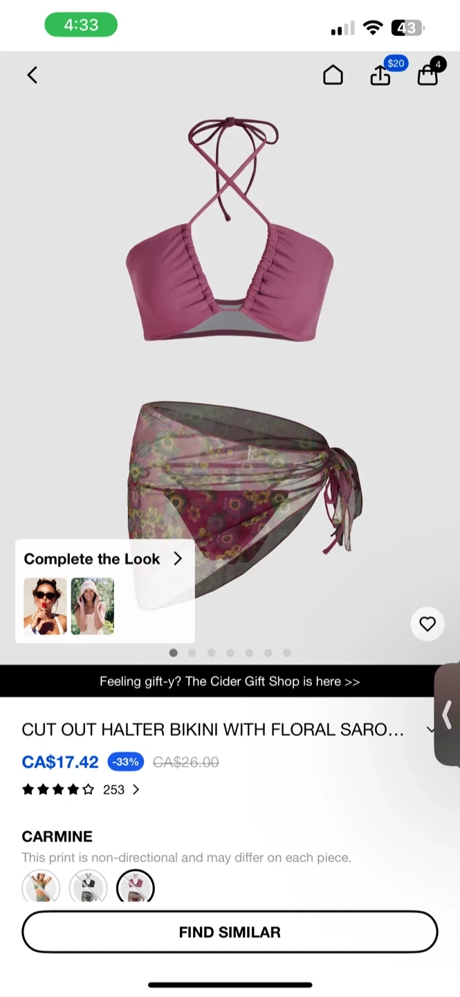 This is a brand new bikini set from Cider! It's a cut out halter bikini with a floral sarong in the colour carmine. Originally bought for CA$26.00 - now only $15 for two of them.