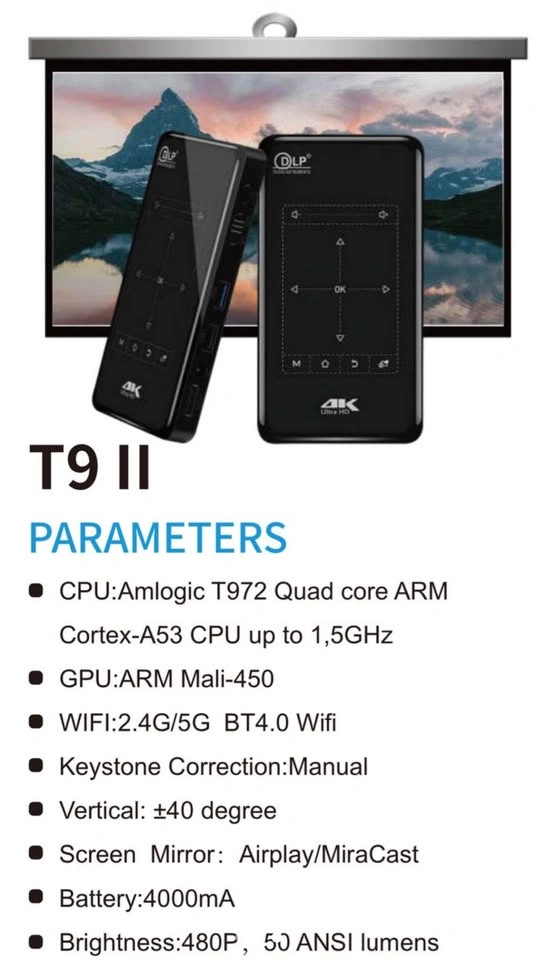 10Brand New Mini Projector -smaller then iPhone 14 Pro Max Built-In Android System Pick up in Markham (Kennedy Rd & 16th Ave) No delivery Cash only $200 T9 II PARAMETERS • CPU:Amlogic T972 Quad core 1GB+8GB Cortex-A53 CPU up to 1,5GHz • GPU:ARM Mali-45OS: Android 9.0 • WIFI:2.4G/5G BT4.0 Wifi • Keystone Correction:Manual • Vertical: £40 degree • Screen Mirror: Airplay/MiraCast • Battery:4000mA • Brightness:480P, 50 ANSI lumens