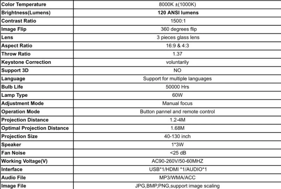 10HY300 Smart Projector, brand new with built-in Android System. Pick up in Markham (Kennedy Rd & 16th Ave). Cash only $70 Product: Model HY300 Product Description: Smart Projector Operation System: Android 11.0 CPU: Quad-core ARM Cortex-A53 GPU: Mali-G31 supports OpenGL ES3.2,Vulkan 1.1,and OpenCL2.0 Buffer Memory(RAM): 1G (optional 2GB) Storage(ROM): 8G (optional 16/32/64GB) WIFI: AW869A -- Dual band WiFi6 + BT5.0 Module Spec HDMI: Optional HDMI IN/HDMI OUT Projection Technique: 2.69inch LCD TFT display Native Resolution: 1280*720P Supported Resolution: 720P Color Temperature: 8000K ±(1000K) Brightness(Lumens): 120 ANSI lumens Contrast Ratio: 1500:1 Image Flip: 360 degrees flip Lens: 3 pieces glass lens Aspect Ratio: 16:9 & 4:3 Throw Ratio: 1.37 Keystone Correction: voluntarily Support 3D: NO Language: Support for multiple languages Bulb Life: 50000 Hrs Lamp Type: 60W Adjustment Mode: Manual focus Operation Mode: Button pannel and remote control Projection Distance: 1.2-4M Optimal Projection Distance: 1.68M Projection Size: 40-130 inch Speaker: 1*3W Fan Noise: <25 dB Working Voltage(V): AC90-260V/50-60MHZ Interface: USB*1/HDMI *1/AUDIO*1 Audio File: MP3/WMA/ACC Image File: JPG,BMP,PNG,support image scaling Video File: Full-format decoding including HEVC/VP9/AVS2/AVC 4K@30fps and MPEG1/MPEG2/AV1 1080p/60fps decoding and so on Text Reading: TXT Machine Size: Ø100.8X188 Color: Black+White Usage: Home theater, entertainment, early childhood education, video conference, online teaching Standard Accessory: User Manual,Power cord,Remote control, Adapter: Power cord 1.2m Power supply: 110-220V WIFI: Yes Fast Boot: 3 Sec Product size: Diameter 100.8X103.5MM Desk weight(kg): 0.5kg Net weight: 0.8kg