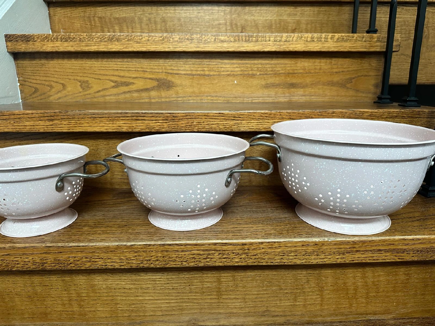 17Selling a set of three pink enamelware colanders! They are in great condition and nest together for easy storage. Perfect for rinsing fruits, veggies, or pasta