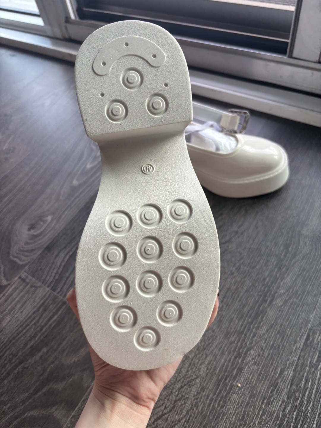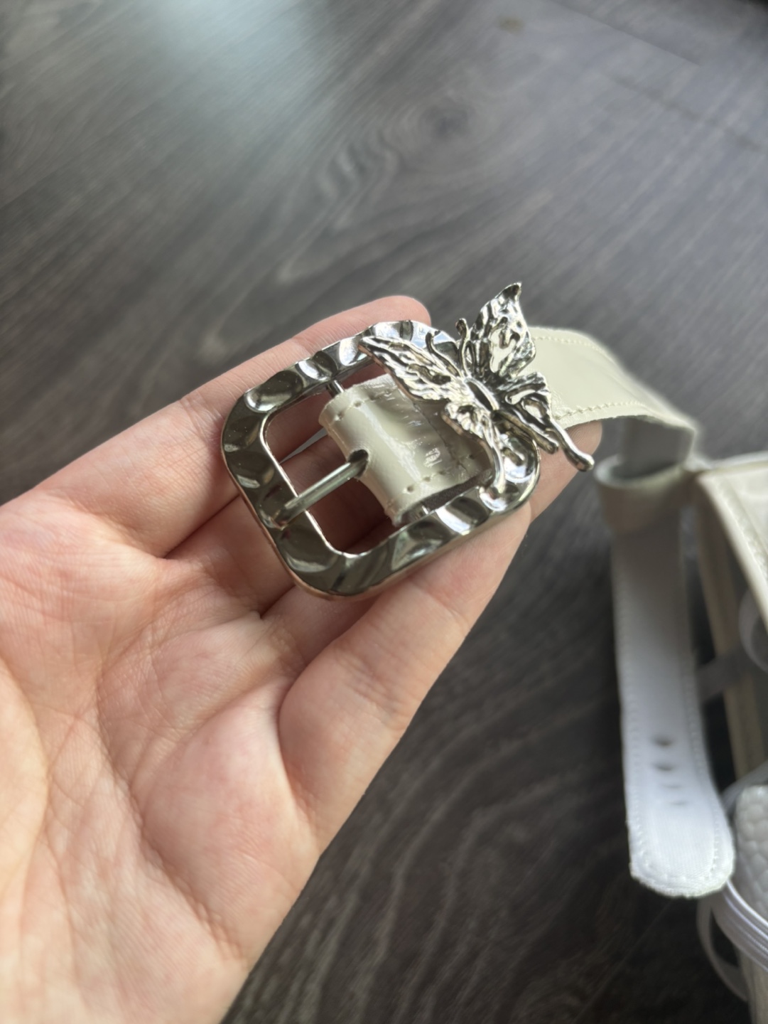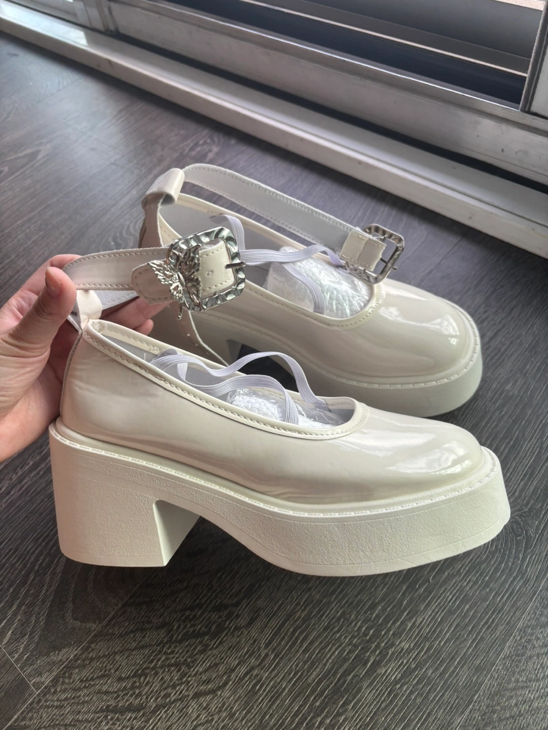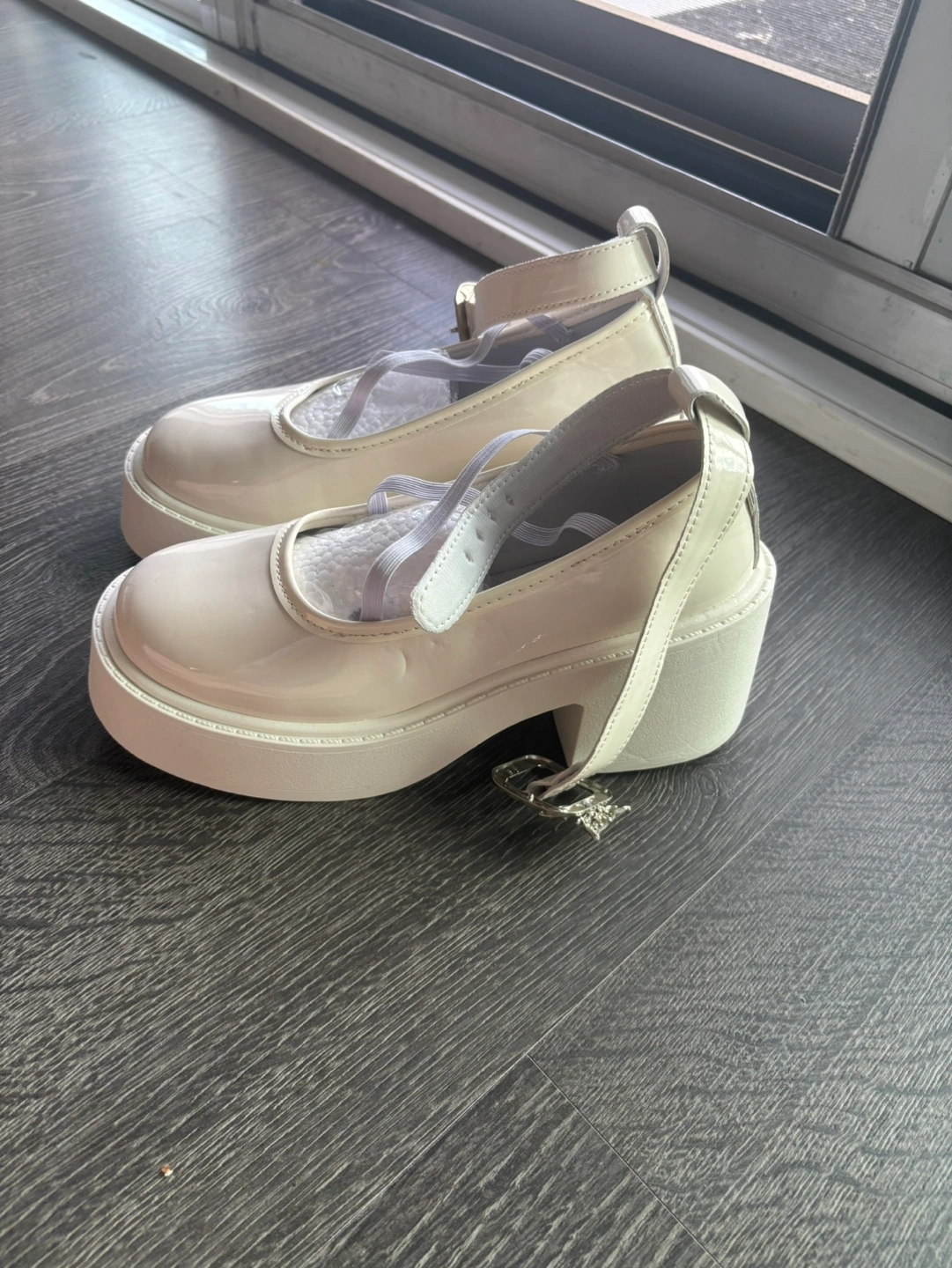 Super cute and coquette white chunky platform heels with beautiful butterfly clasp for around the ankle.
