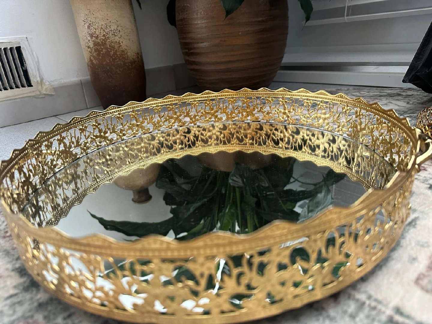 Selling a beautiful gold decorative tray with a mirrored surface. It's perfect for adding a touch of elegance to your home decor. The intricate design and reflective surface make it a lovely accent piece.