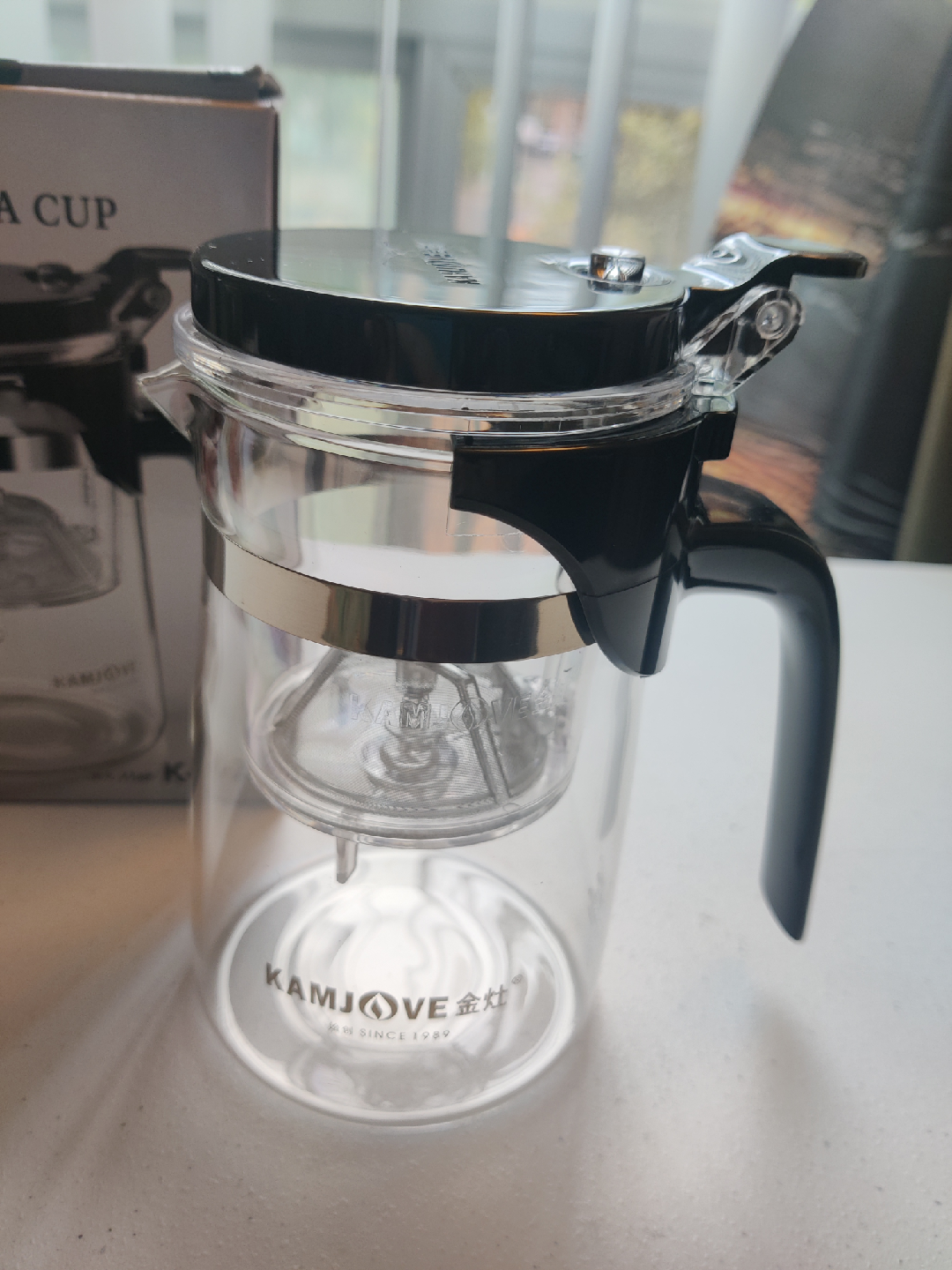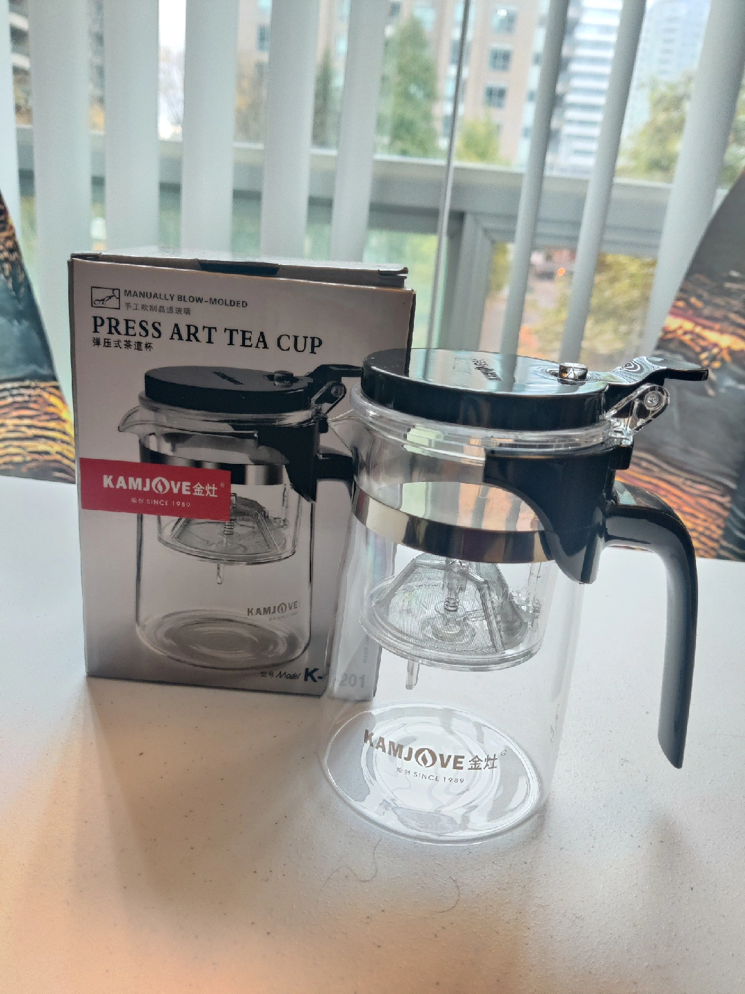 I'm selling a new Kamjove Press Art Tea Cup, model K-201. 500ml. It's a manually blow-molded heat-resistant glass and food-grade safe health material. It features a patented design that ensures water controlling structure, easy control, while stopping pressing, no leaking. Control strength freely. High efficiency filtration to ensure making pure tea.