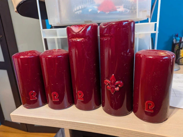 Elegant set of authentic Engels Klassik candles in deep red. Made in Germany by Engels Kerzen, a family candle maker known for premium quality since 1933. Each candle features a glossy finish with embossed relief details — some with the Engels “E” logo, and one with a fleur-de-lis symbol. These candles make a beautiful decorative accent for the holidays, romantic settings, or classic interiors.