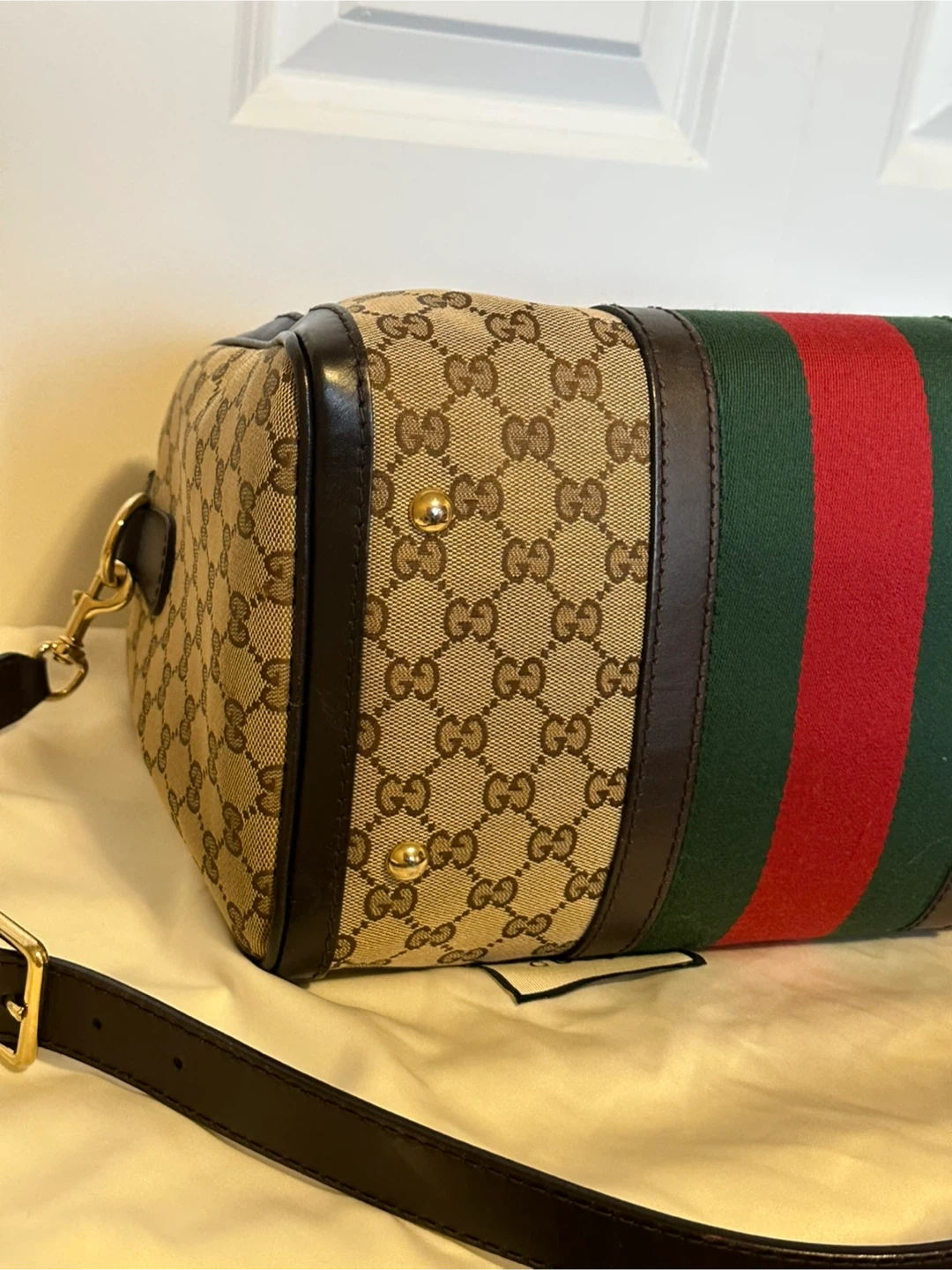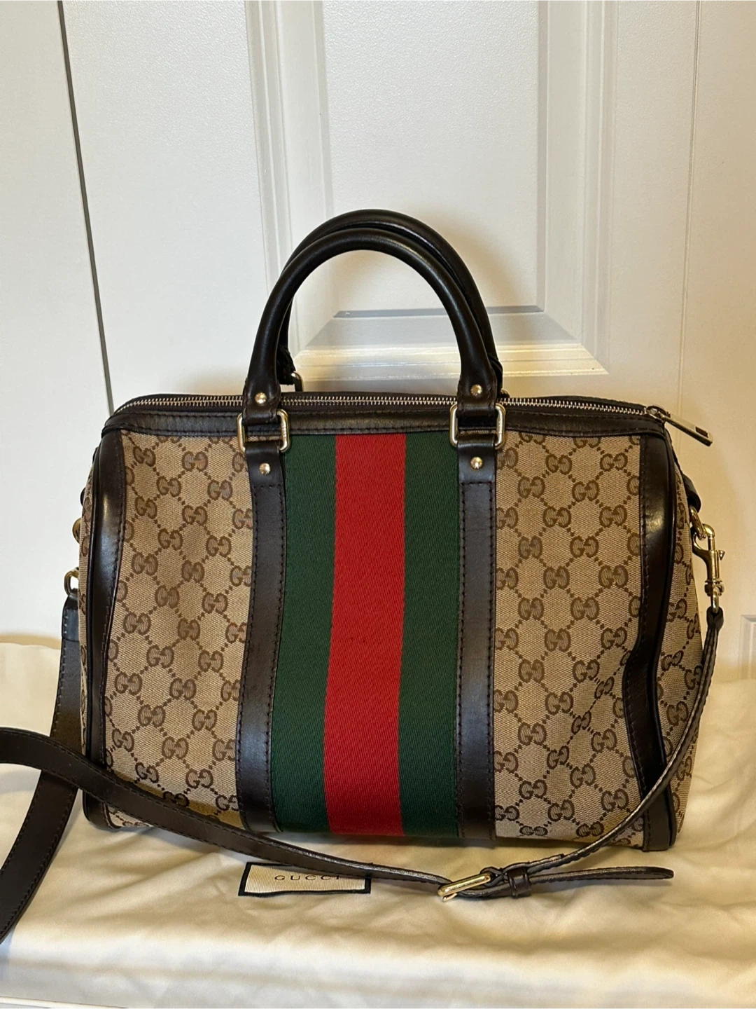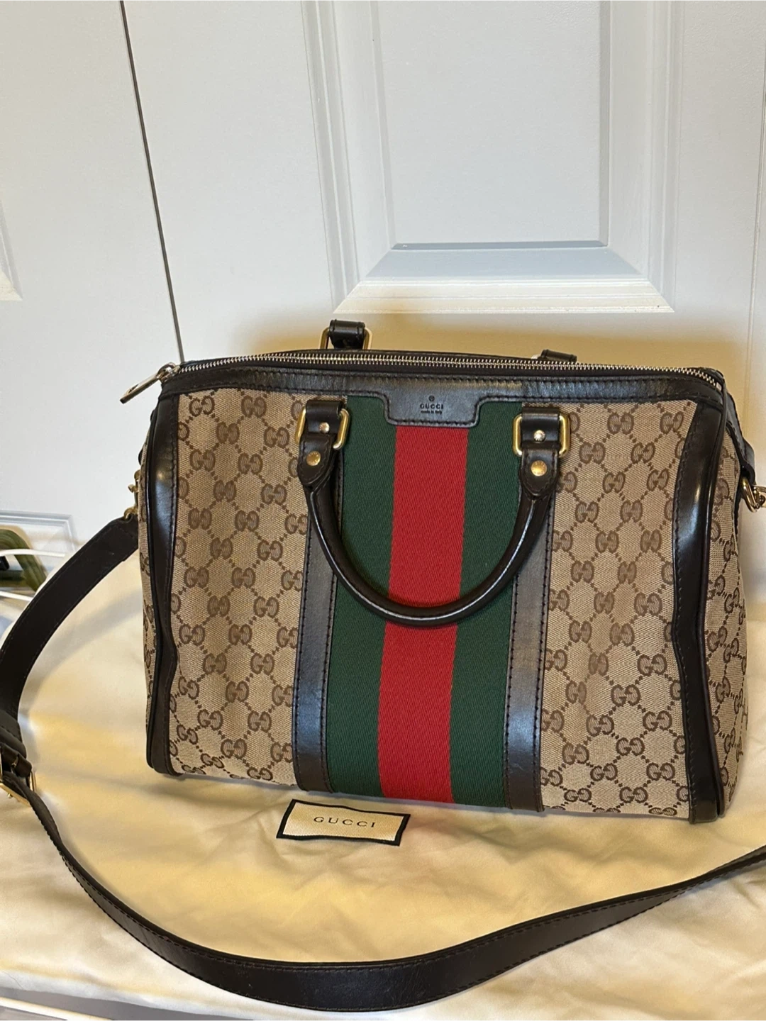 15Selling a Gucci Boston bag. Come with trap, dust bag , receipt, booklet Outside looks perfect, stains inside.