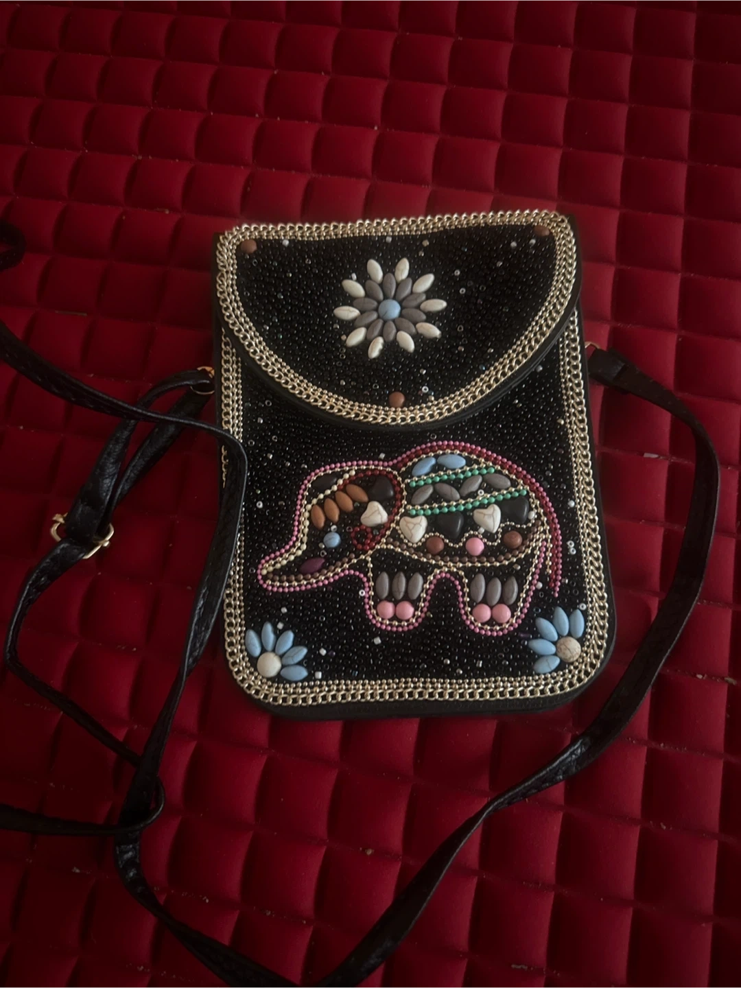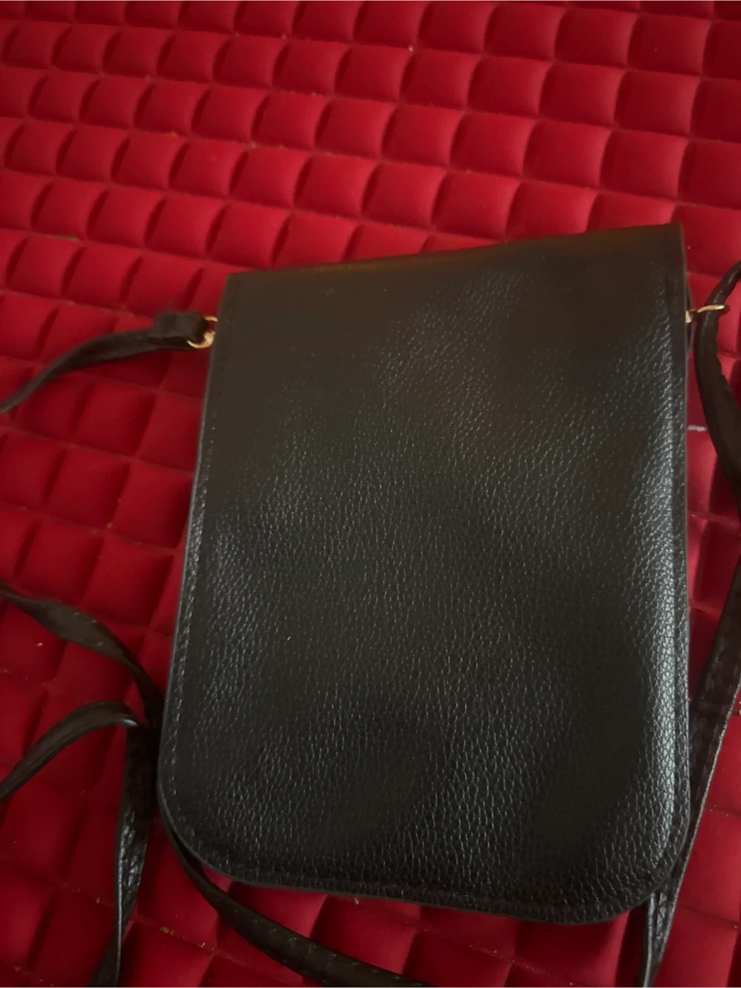 Cute black crossbody bag! perfect for carrying your phone and other small essentials. The inside has a couple of compartments to keep things organized. It also has a decorative design on one side!