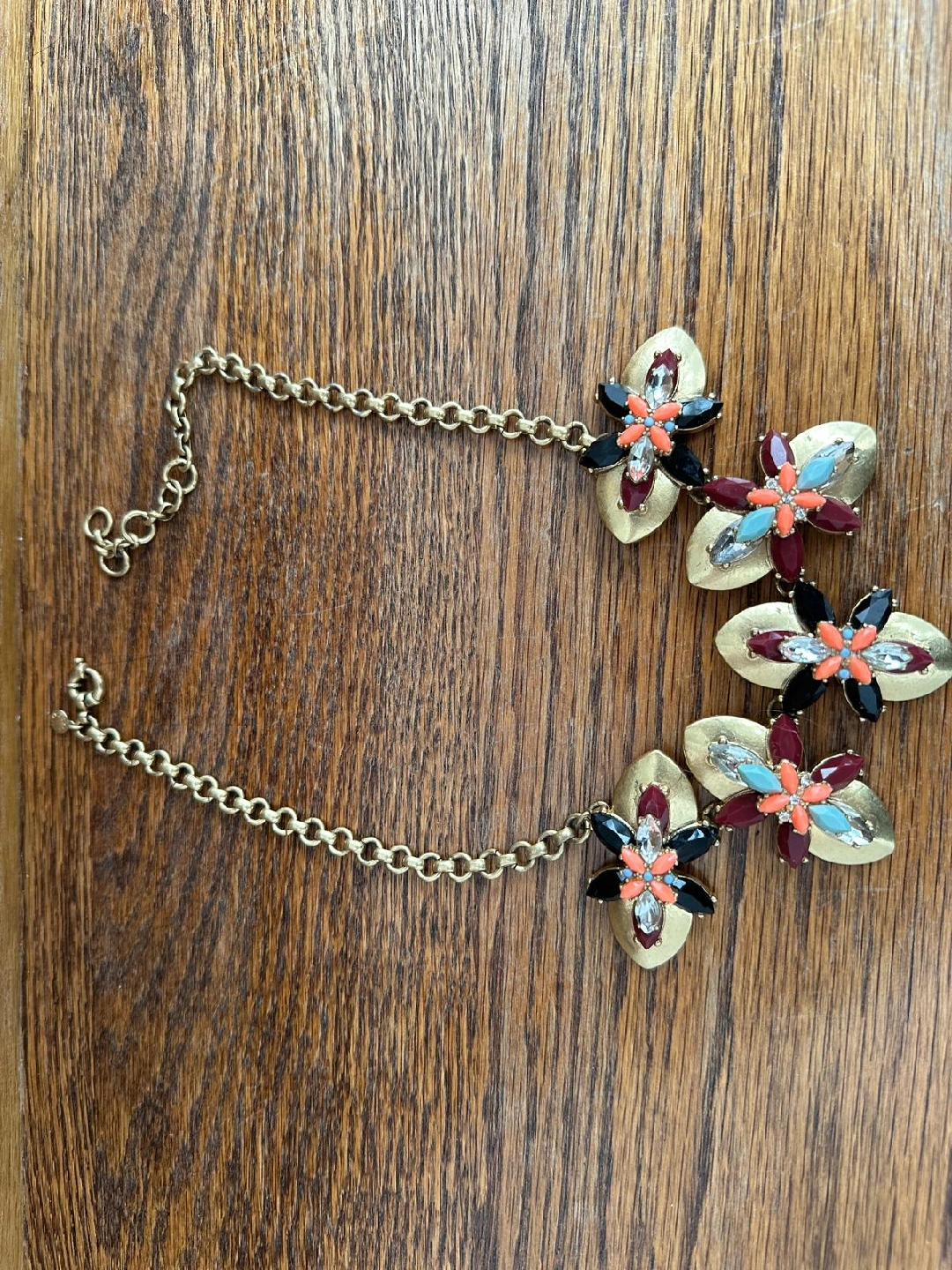 A beautiful gold statement necklace with flower details! The flowers have coral, black, and turquoise coloured accents. Perfect for adding a pop of colour to any outfit