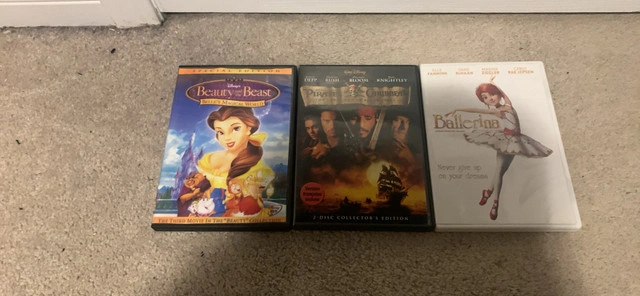10Three DVDs for sale. Includes Disney's Beauty and the Beast special edition, Pirates of the Caribbean: The Curse of the Black Pearl two-disc collector's edition, and Ballerina. Pre-owned.