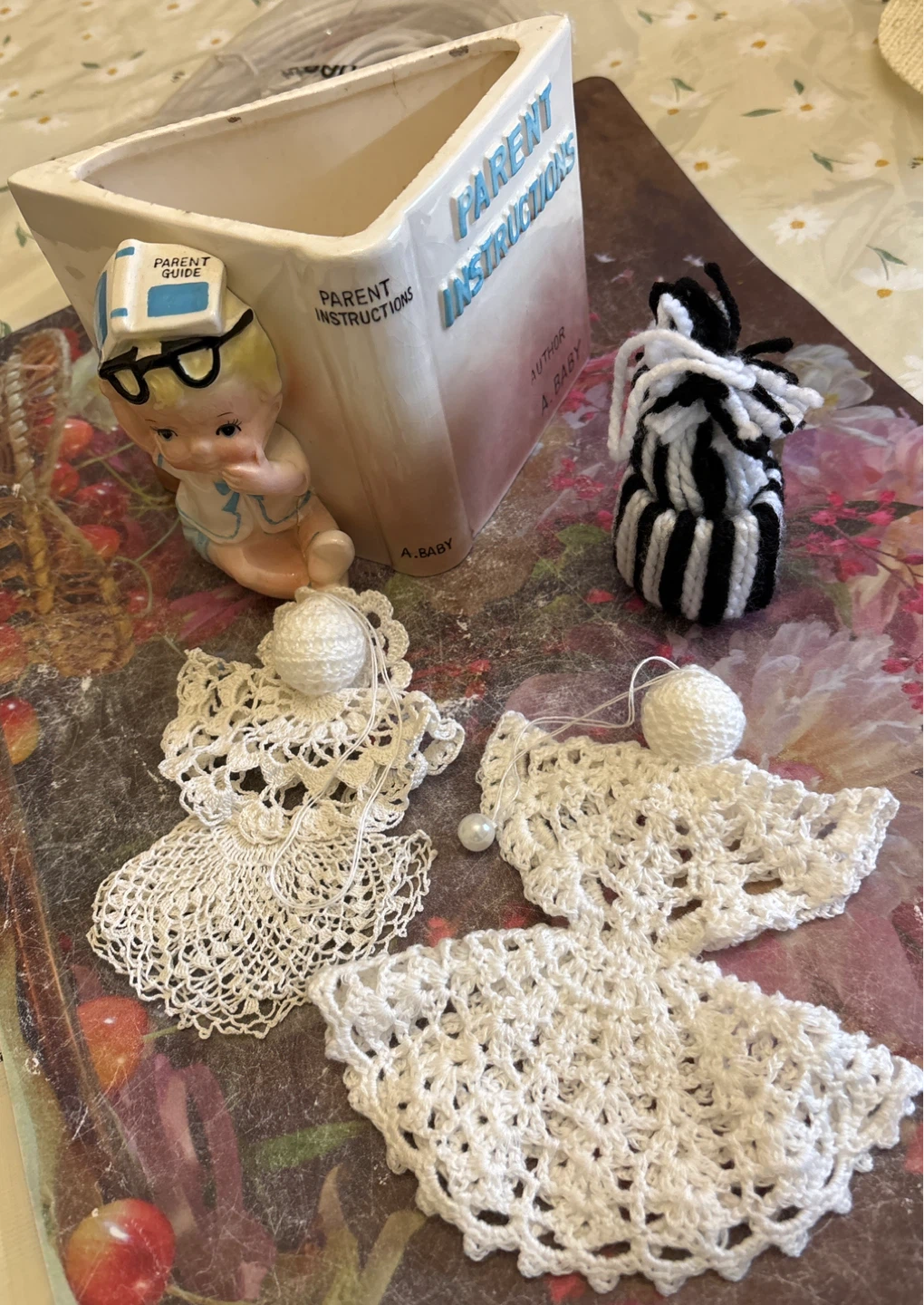 A set of handmade crochet angels, perfect for adding a touch of whimsy to your home decor. They are delicately crafted and ready to bring a bit of charm to any space. Also included is a vintage "Parent Instructions" planter, featuring a cute baby design, adding a nostalgic touch to your collection