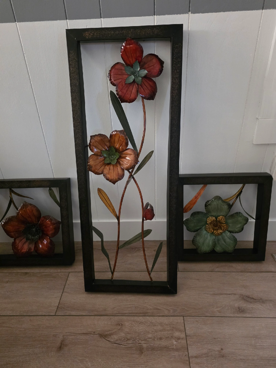 10Add a touch of floral charm to your home with this set of three metal flower wall art pieces! Each piece features a unique flower design in varying colours, framed in a dark metal border. Perfect for adding a pop of colour to any room