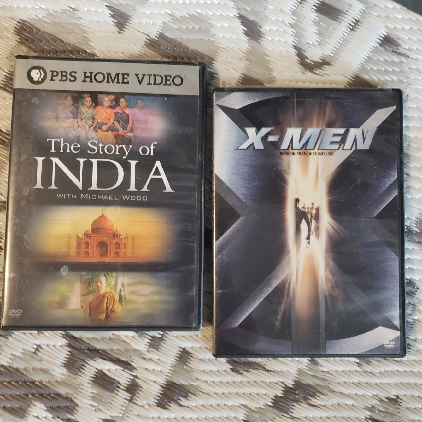 offer DVDs: The Story of India with Michael Wood (PBS Home Video) and X-Men (Version Française Incluse). Both are in good condition and ready for your viewing pleasure!