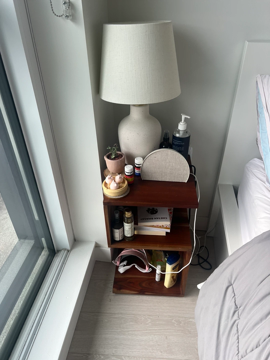 A lovely wooden nightstand with 3 layers for placing items, perfect for keeping your bedside essentials organized. It's in great shape and ready for a new home! It has a nice warm wood tone too