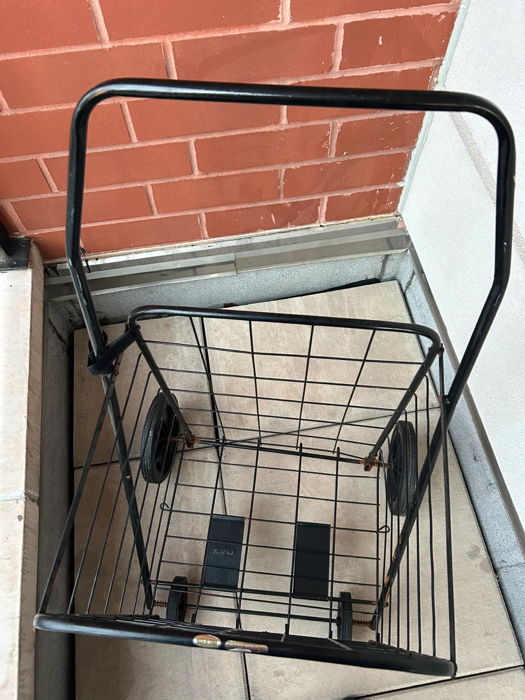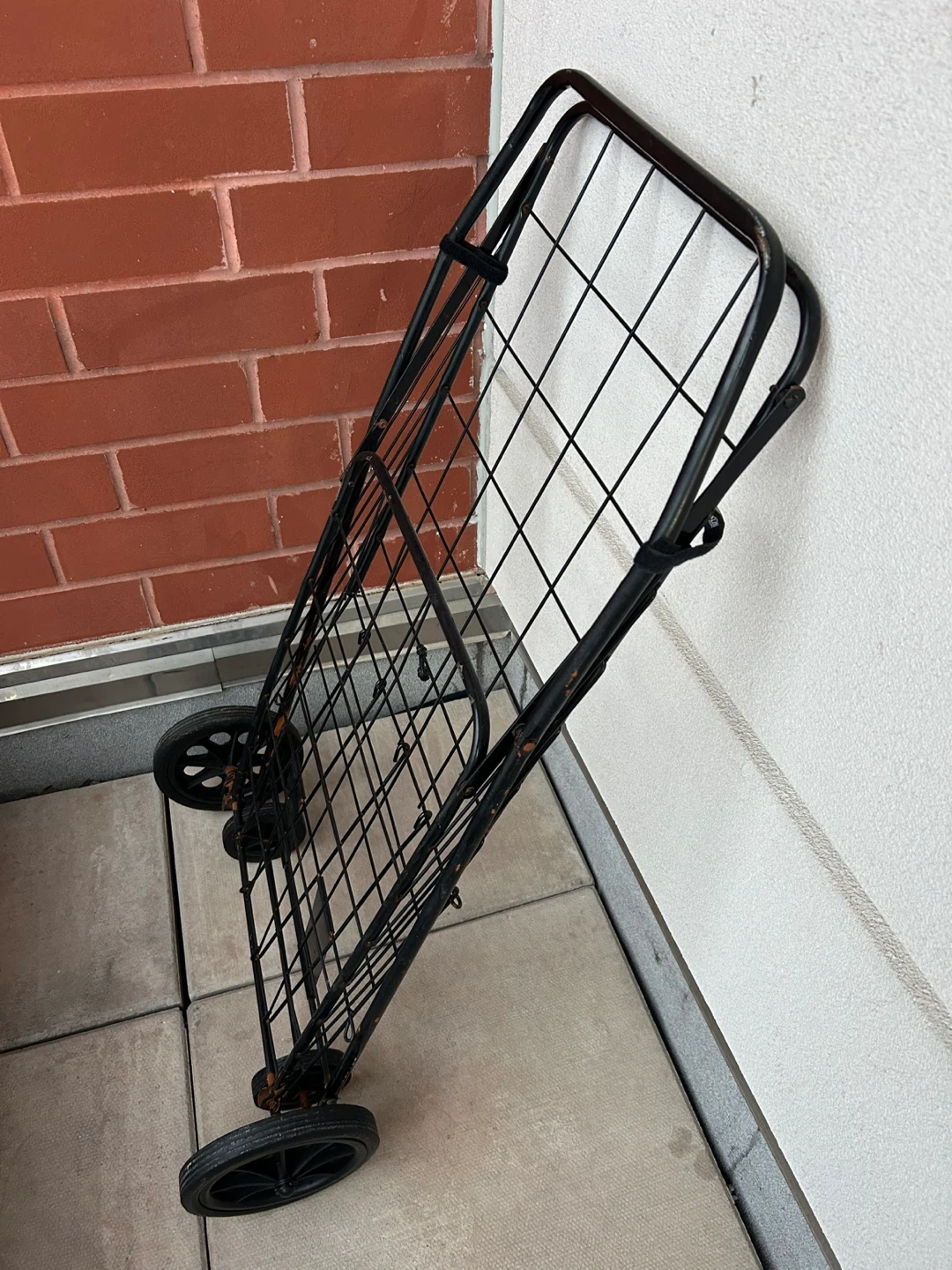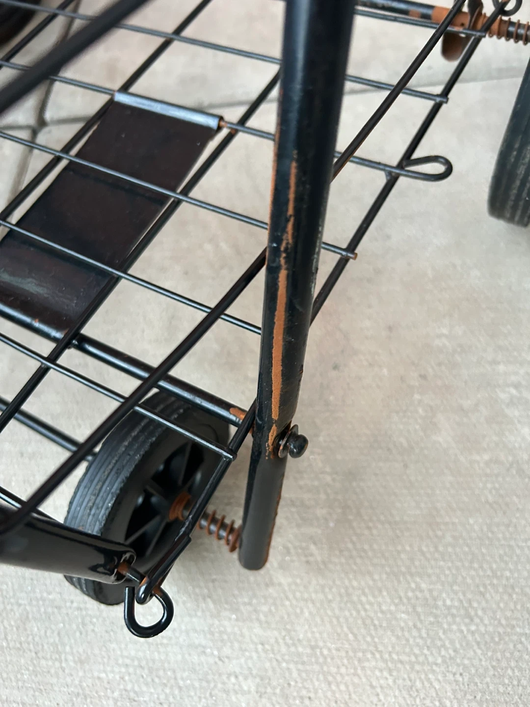 This black metal rolling cart has had better days. It shows some signs of wear and tear, as seen in the photos. May have rust but still rolls around. Perfect for garden, storage or moving items around!