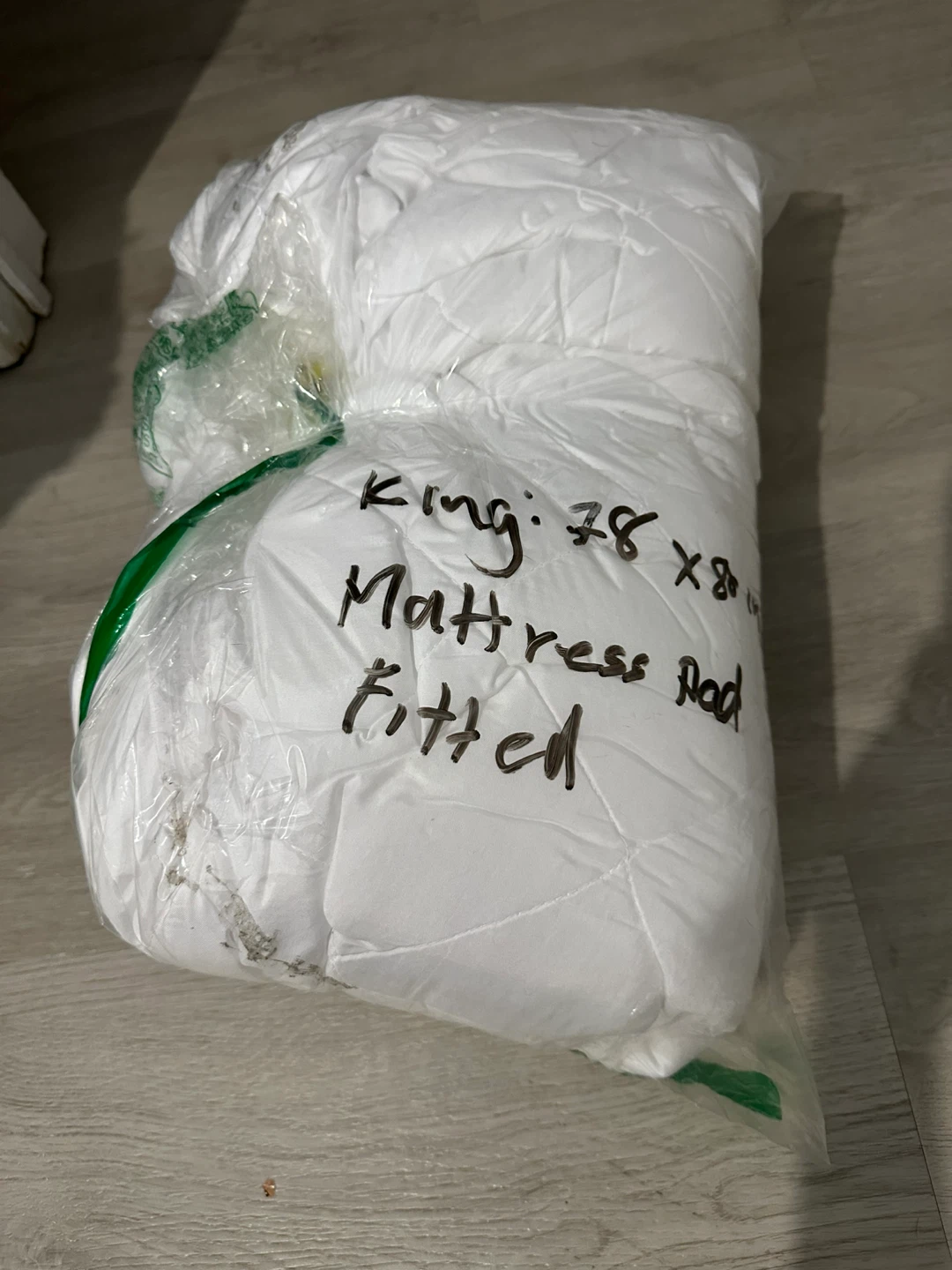 Selling a brand new, king-size fitted mattress pad still in its original packaging! The size is 78 x 80 inches. It's white and ready to keep your mattress comfy and protected