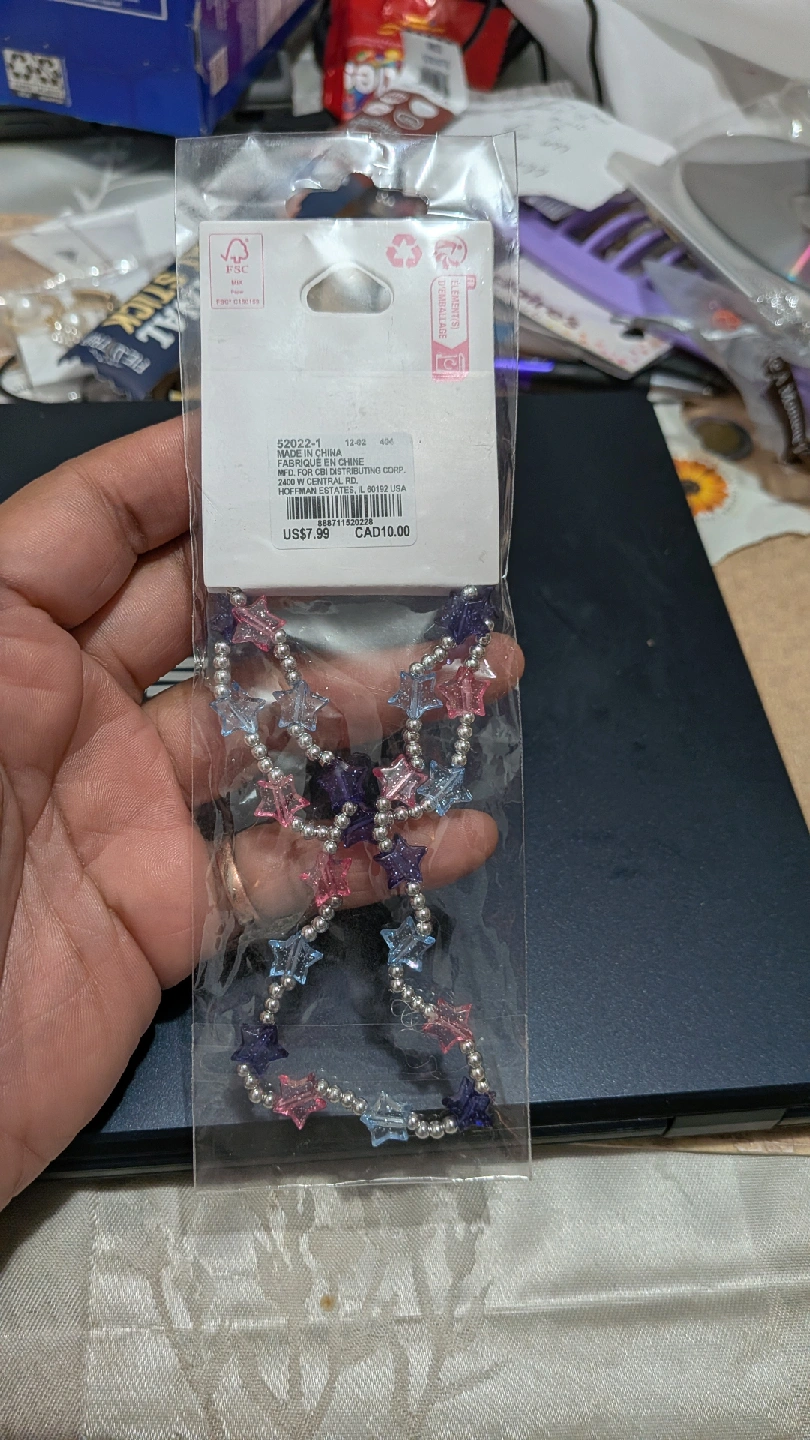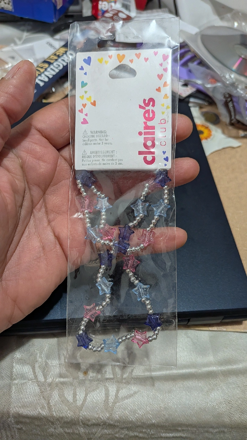 This is a cute Claire's Club star necklace, still new in its original packaging! The necklace features a string of star-shaped beads in pink, blue, and purple colors. Originally priced at $7.99 USD or $10 CAD.