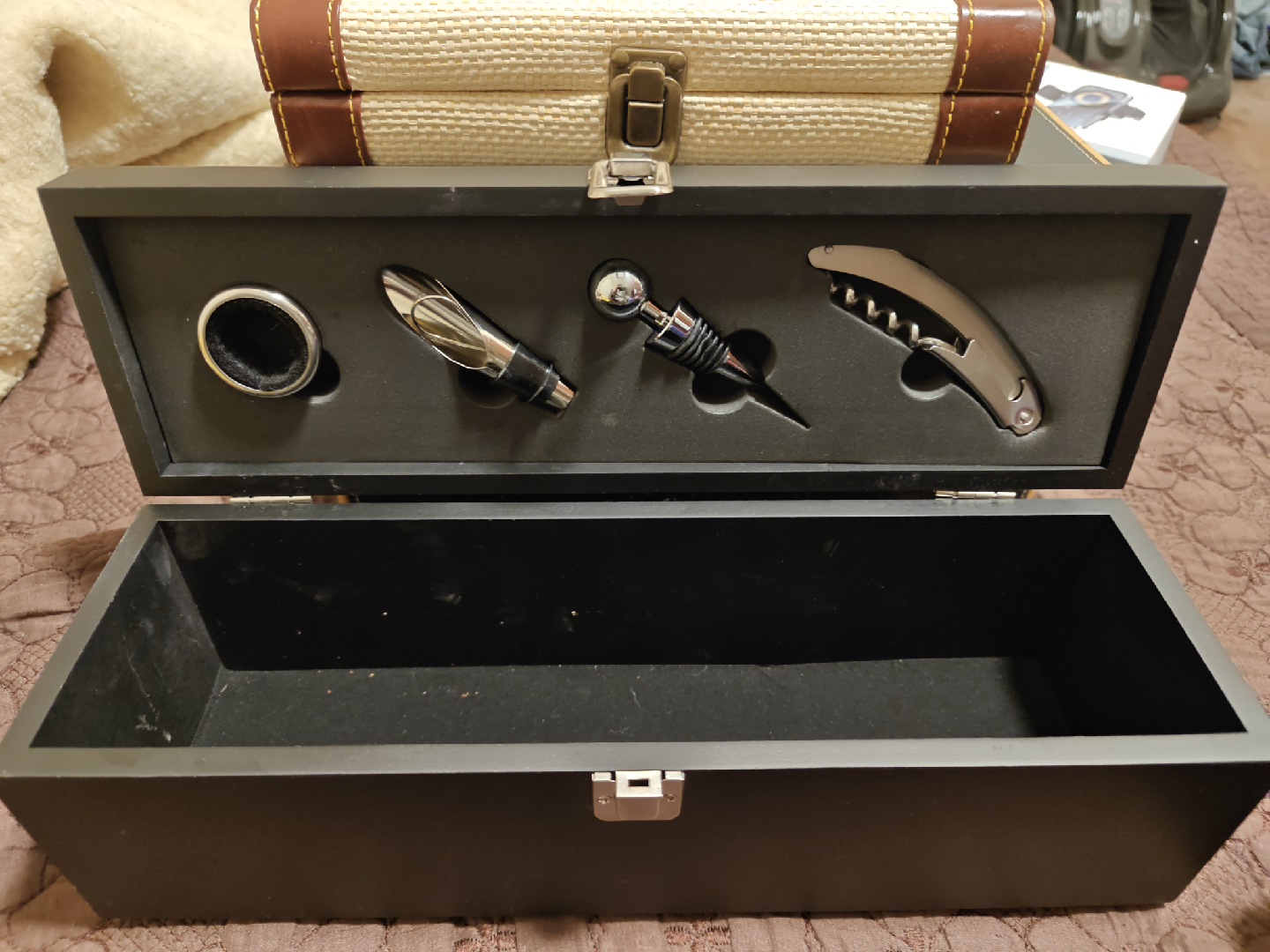 Selling a wine accessory set that comes in a stylish wooden box.