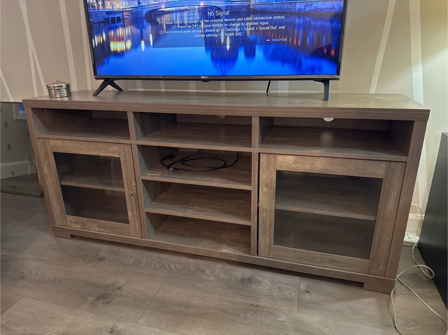 Selling a very sturdy TV stand. It has a great wood-look finish, heavy, and lots of storage space with shelves and cabinets.