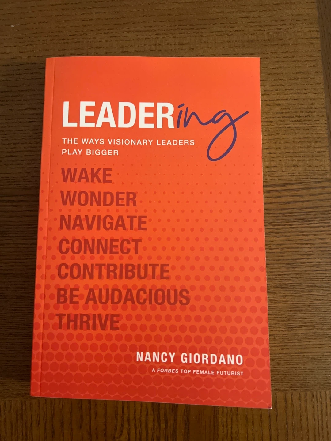 Selling the book LEADERing by Nancy Giordano. It explores the ways visionary leaders play bigger. It covers topics such as waking, wondering, navigating, connecting, contributing, being audacious, and thriving
