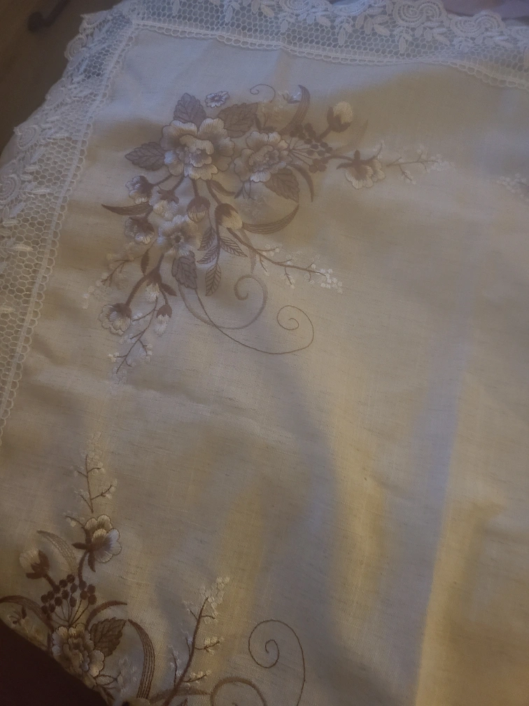 Beautiful tablecloth with delicate floral embroidery and lace trim. It's in great condition and would add a lovely touch to any table setting!