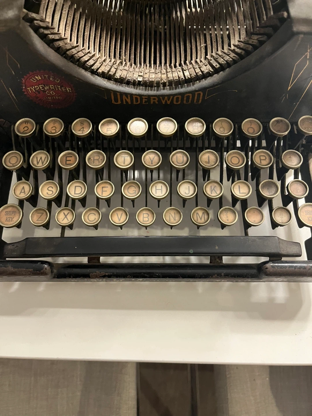 Selling an antique Underwood typewriter. It has a classic look and would be a great piece for a collector or as a decorative item. It shows signs of wear consistent with its age, but it still has a lot of character!