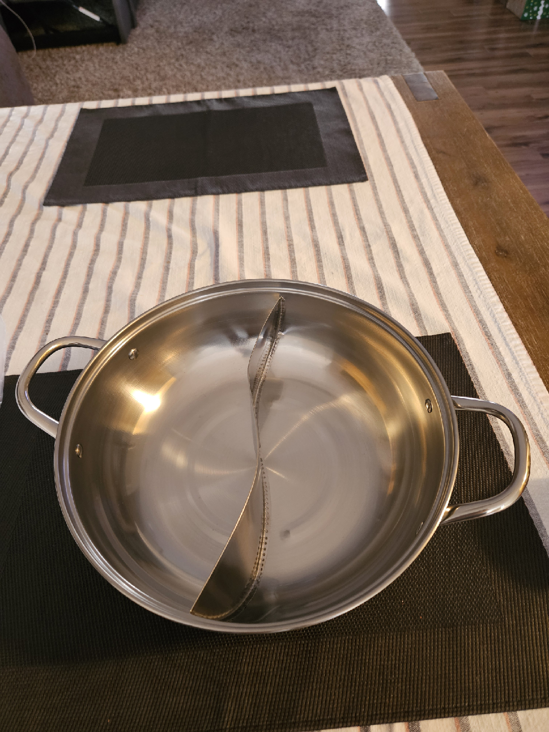 Selling a brand new stainless steel hot pot! It features a convenient divider, perfect for cooking two different broths or dishes at the same time. It's in excellent condition and ready for your next hot pot night!
