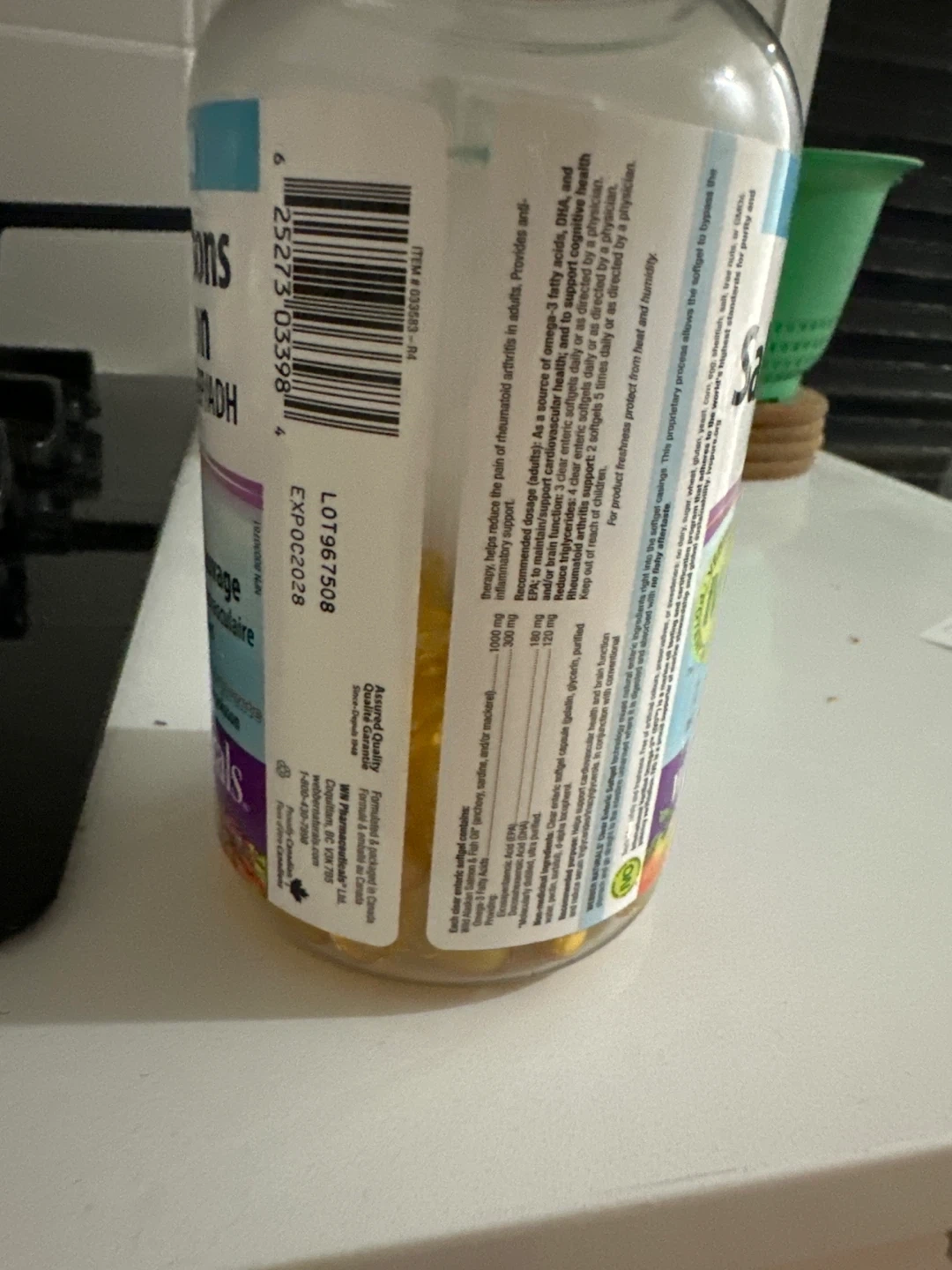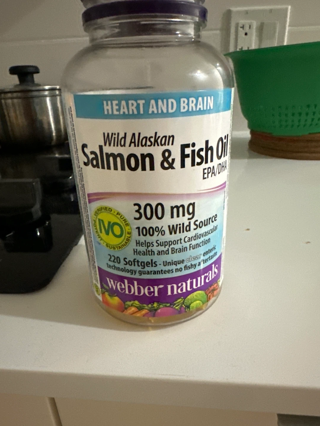*Please keep in fridge* 30-40% left Giving away free a bottle of Webber Naturals Wild Alaskan Salmon & Fish Oil EPA/DHA. Each softgel contains 300mg of 100% Wild Source to help support cardiovascular health and brain function. There are 220 softgels in the bottle. Expiry date is October 2028