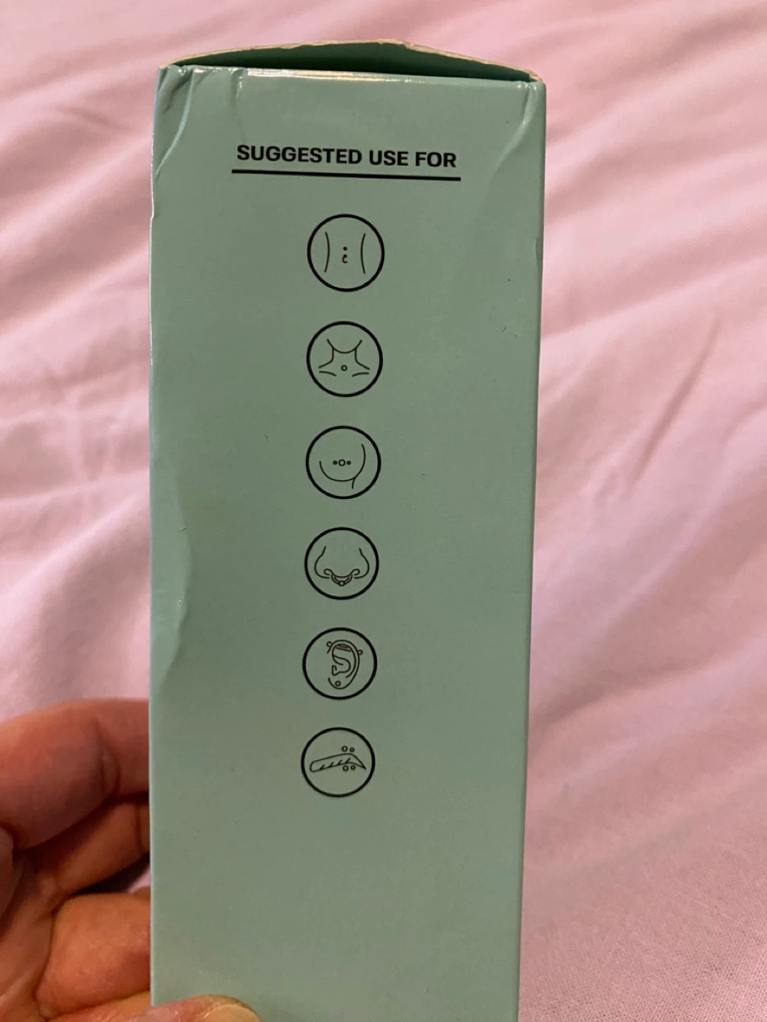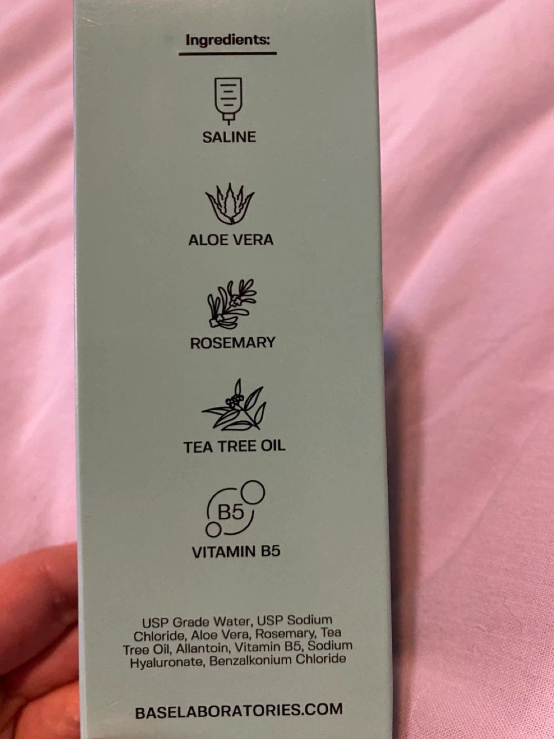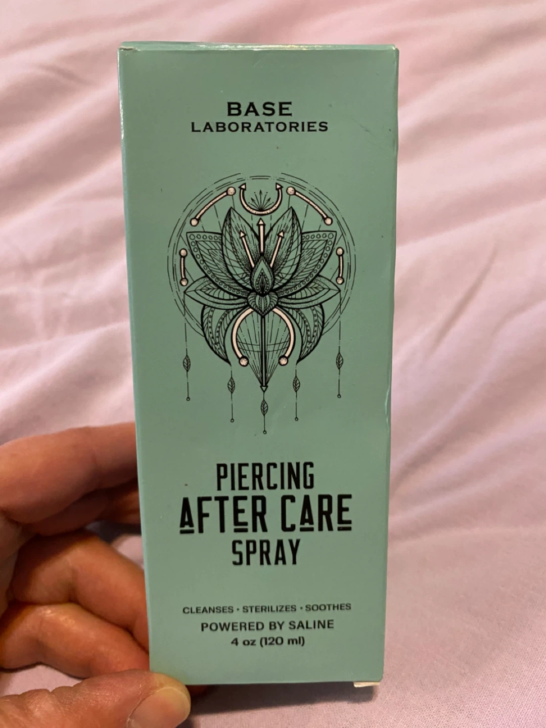 Selling a bottle of Base Laboratories Piercing Aftercare Spray. It's a cosmetic cleansing solution specifically formulated to cleanse and soothe new body piercings. Contains saline, aloe vera, rosemary, and tea tree oil. It's powered by saline and the bottle contains 4 oz (120 ml). The expiration date is April 14, 2027