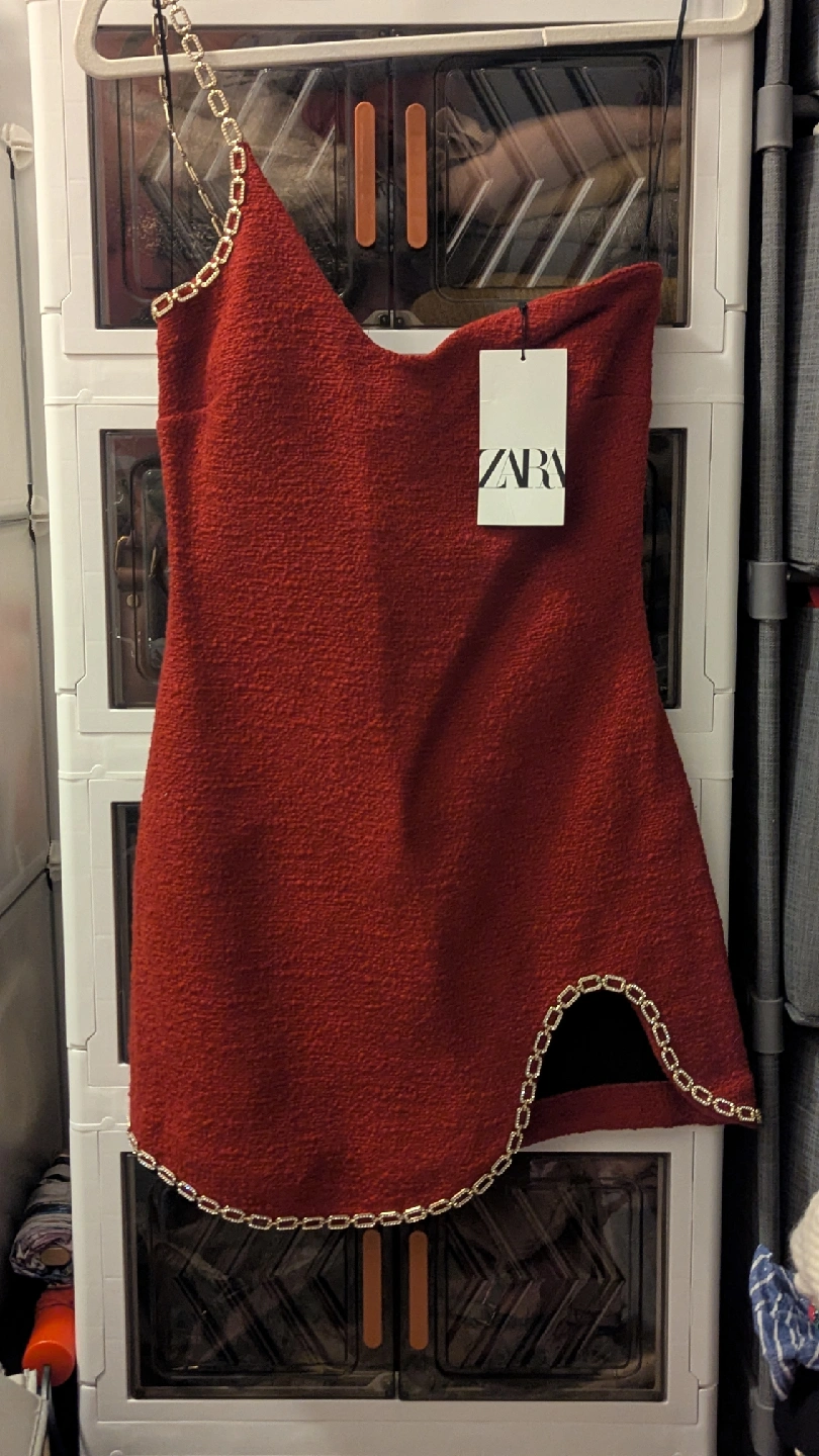 This is a Zara red party dress in size XS. It has a unique one-shoulder design with decorative chain detailing. Originally bought for $89.90