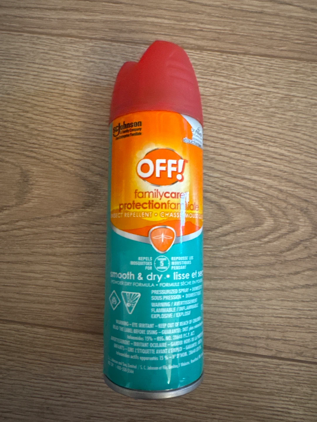 Selling a can of OFF! FamilyCare insect repellent. It repels mosquitoes for up to 5 hours. It's a smooth and dry powder formula, so it's not sticky. Keep those pesky bugs away!