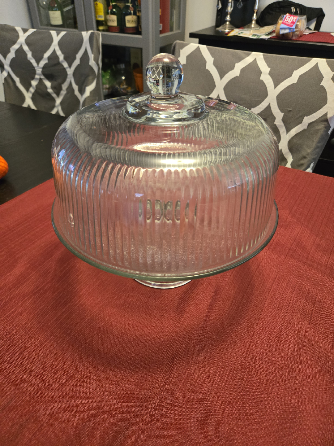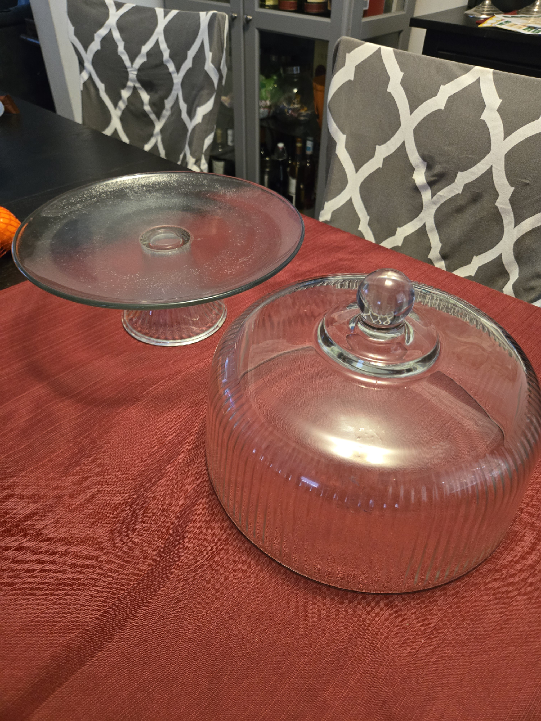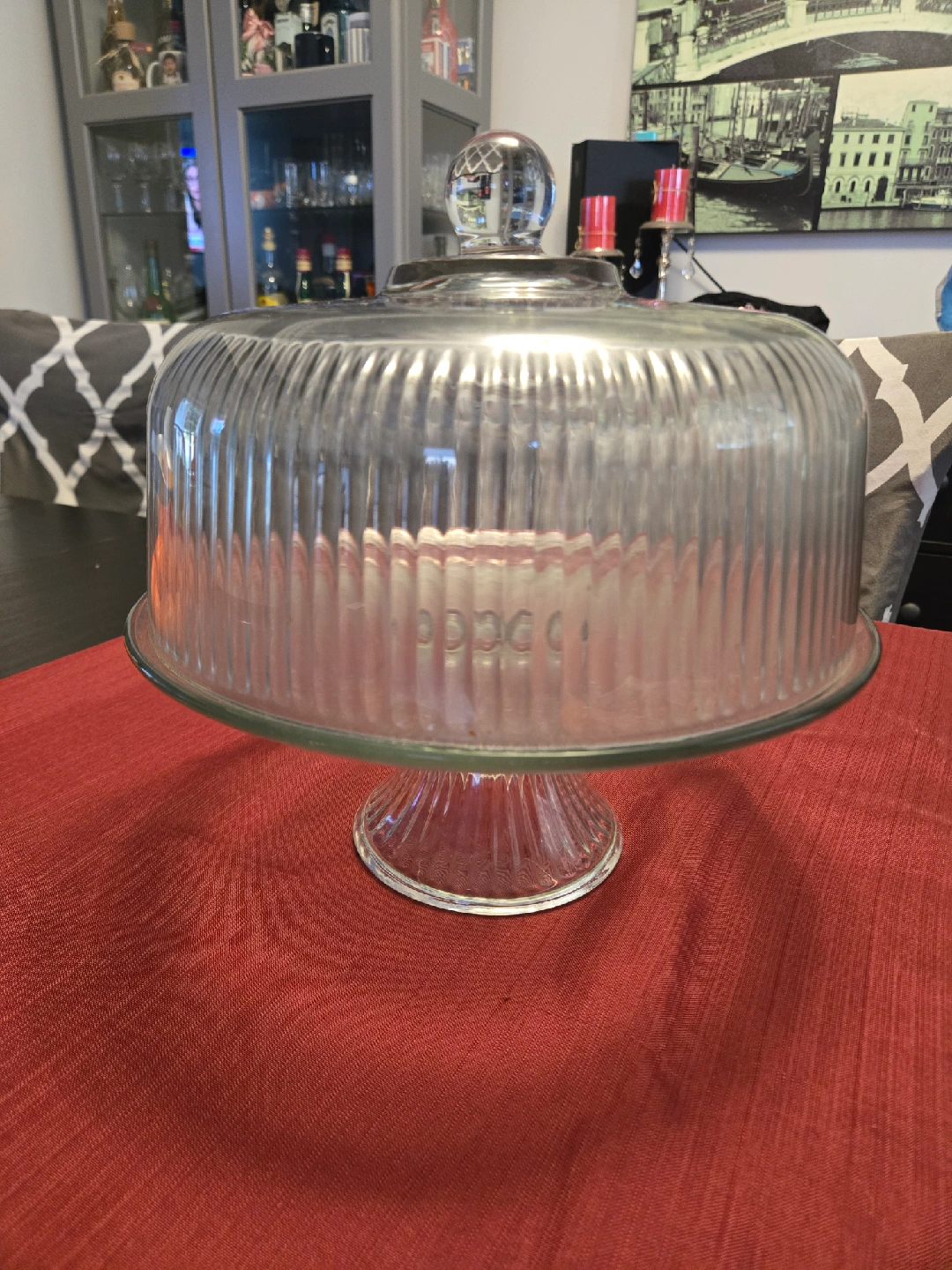 Selling a glass cake stand with a dome lid. It's in good condition and perfect for displaying your baked goods or desserts. Great for parties or everyday use!