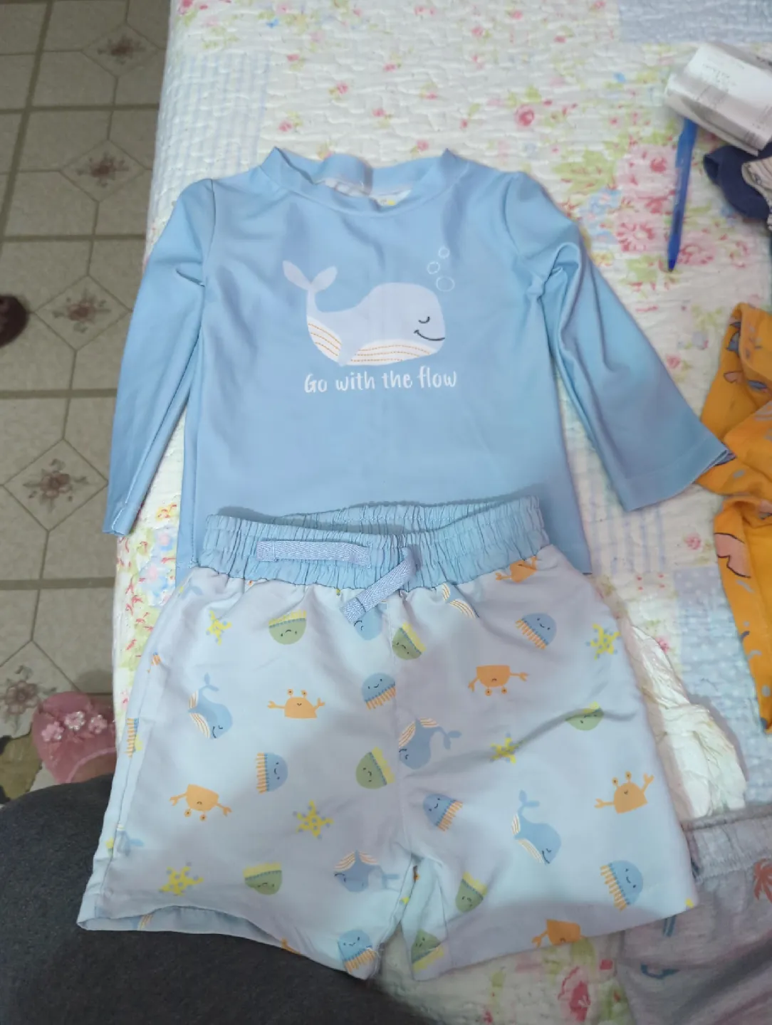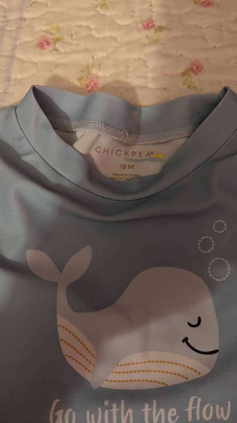 Cute Chickpea brand baby swim set, size 18 months! The top is a light blue rash guard with a whale design and the shorts are patterned with sea creatures