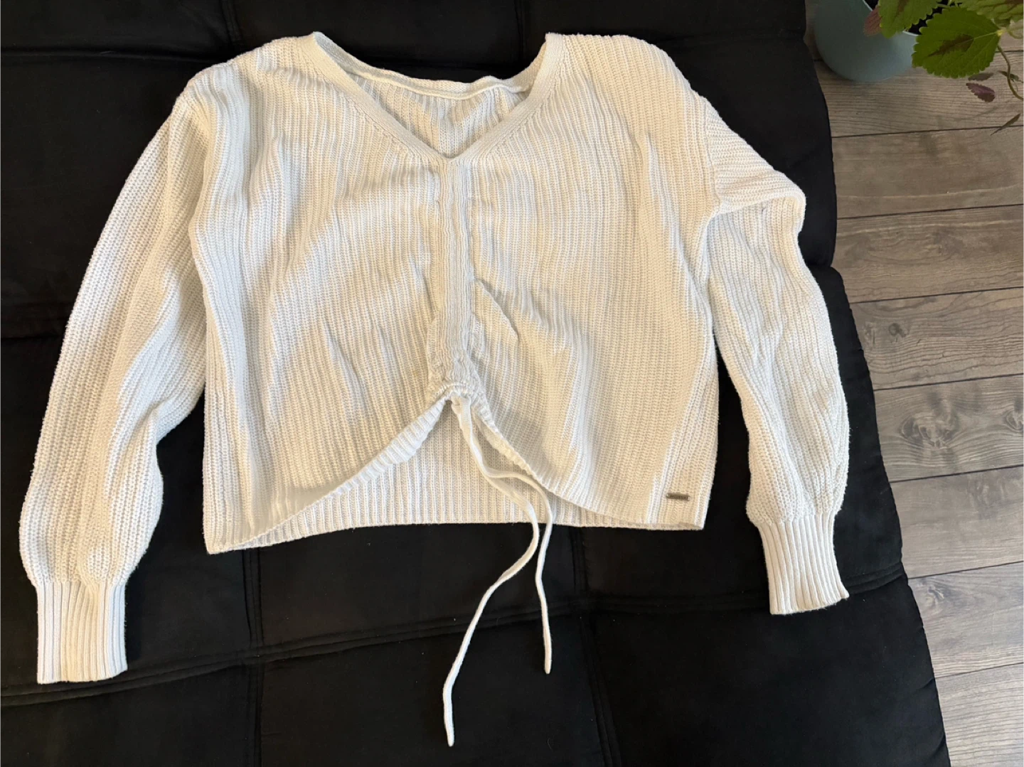 A cute and comfy white knit sweater from Hollister! It features a cinched front with adjustable ties. Perfect for layering or wearing on its own
