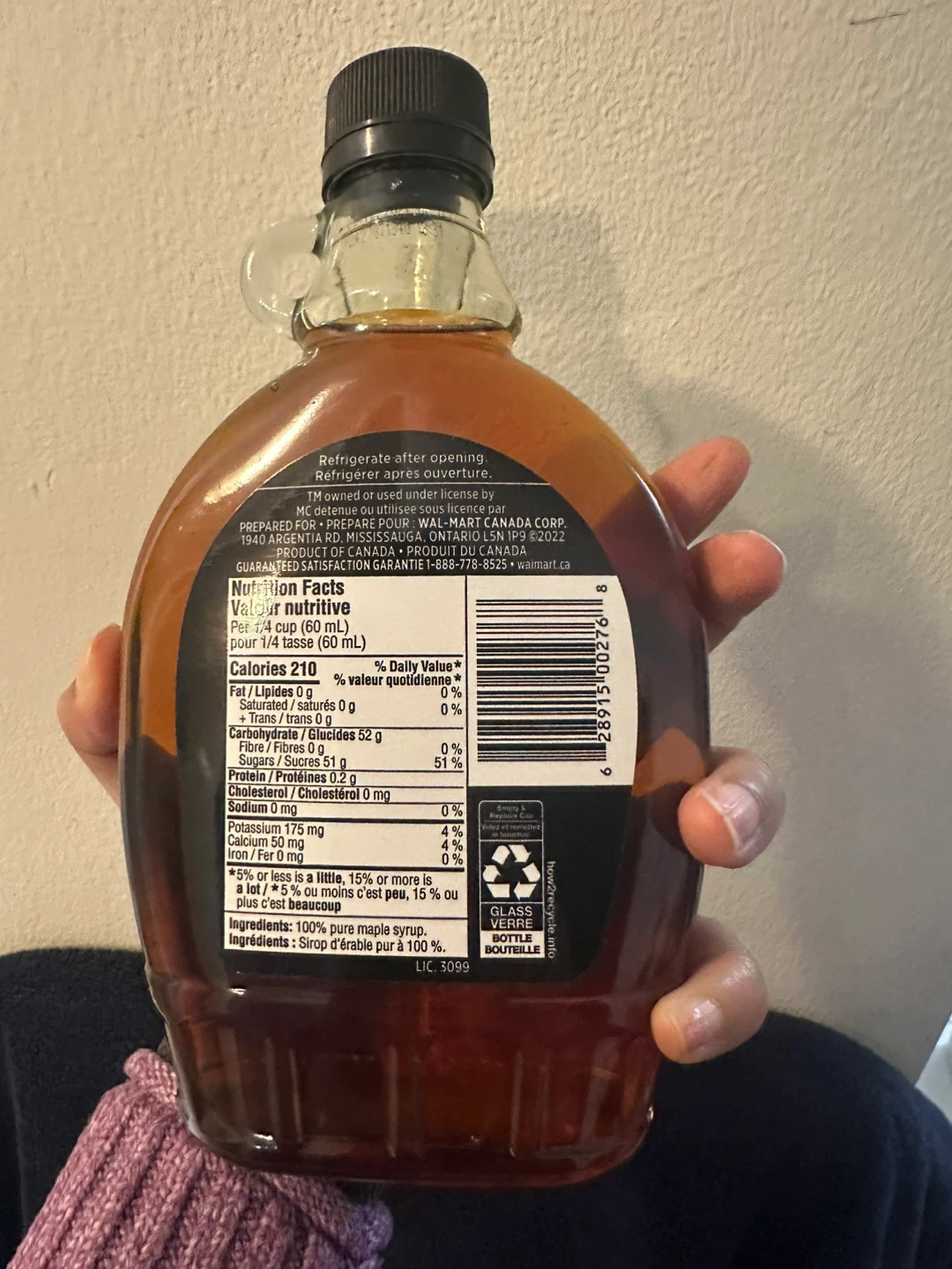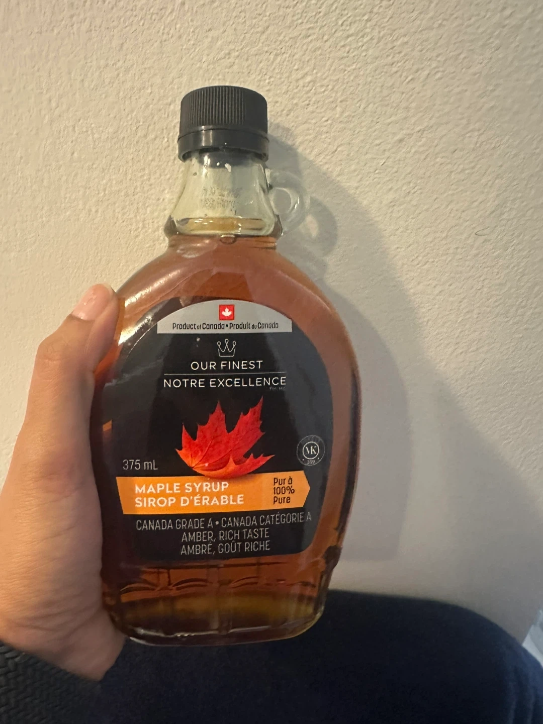 Giving away a bottle of Our Finest maple syrup. It's 375 mL and 100% pure Canada Grade A, with a rich amber taste. Perfect for pancakes, waffles, or any treat that needs a touch of maple goodness! Expiry Dec 2027