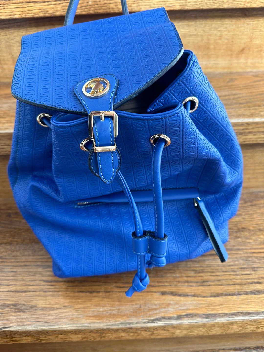 17This backpack in a vibrant blue colour. It's in great condition and ready for a new home! The backpack features a unique textured pattern and gold-tone hardware, adding a touch of elegance. Perfect for everyday use or travel