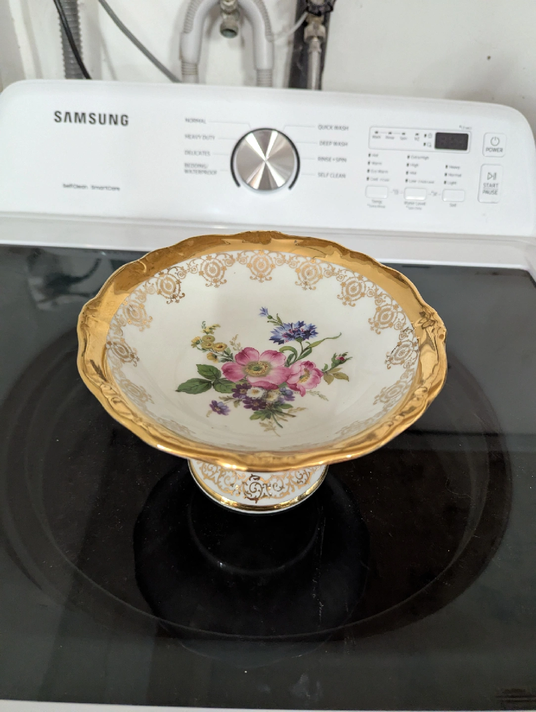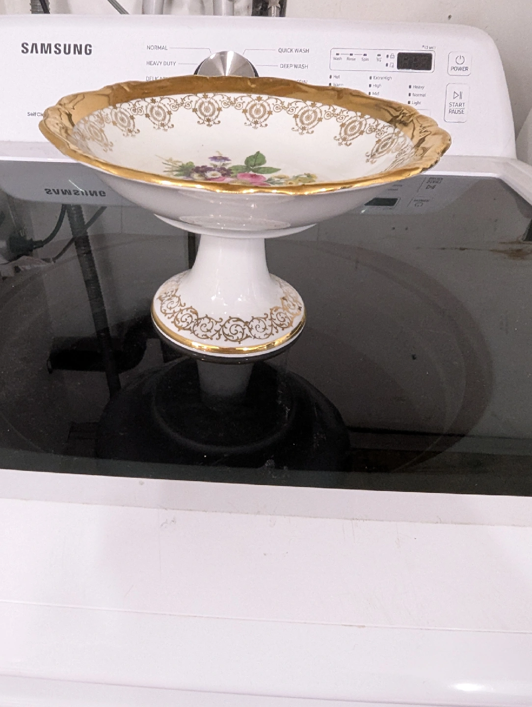 47This is a lovely vintage footed bowl, perfect for adding a touch of elegance to your home. It features a beautiful floral design with delicate gold trim around the edges. It's in great condition and would look stunning as a centerpiece or decorative piece