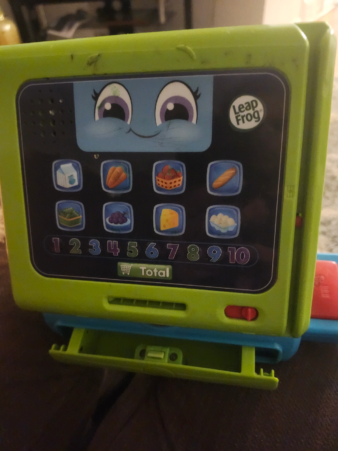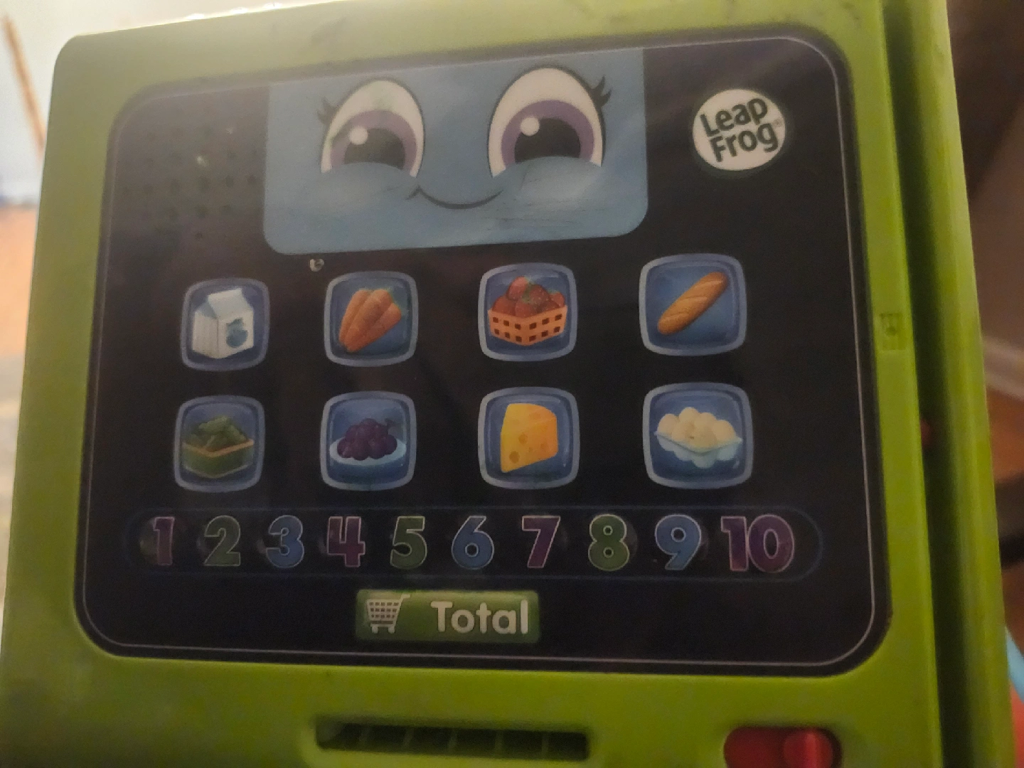140This is a LeapFrog cash register toy. It has buttons with different food items and numbers to press. It also has a little drawer that opens up!