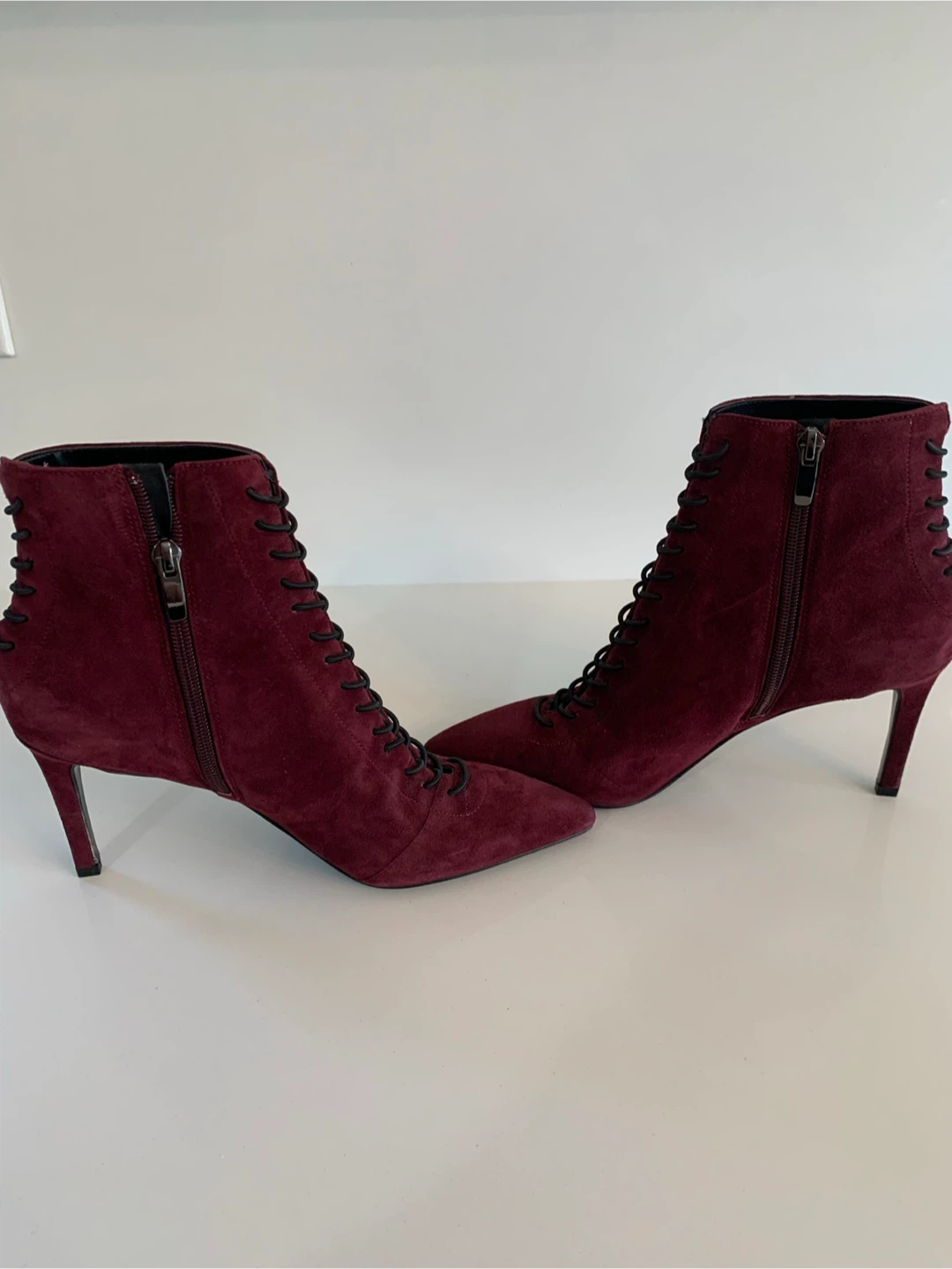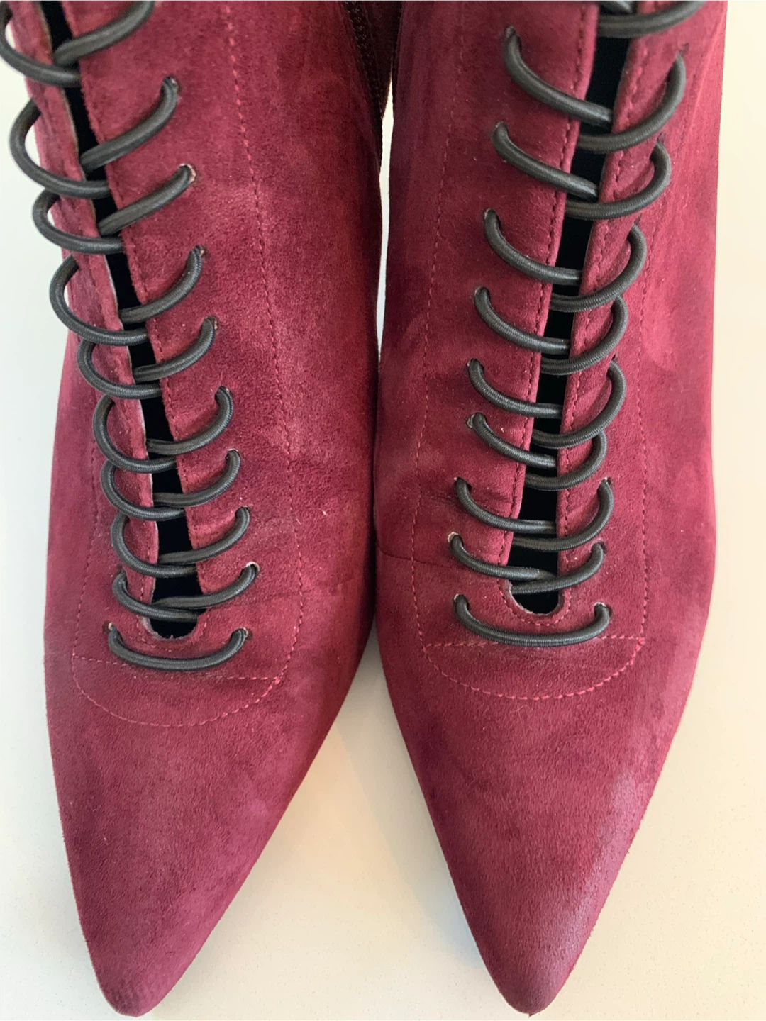 Selling a pair of Kendall and Kylie burgundy suede lace-up booties in size 8.5. These stylish ankle boots feature a pointed toe and a stiletto heel. They have a unique lace-up design on the front and a zipper closure on the side. Perfect for adding a pop of colour to your outfit!