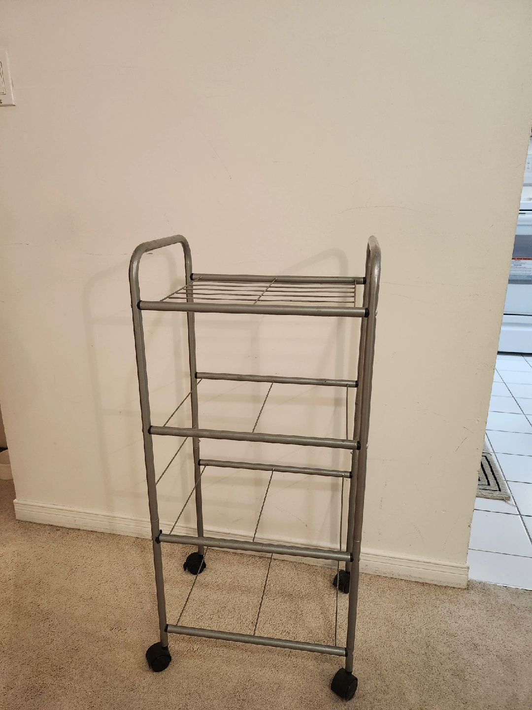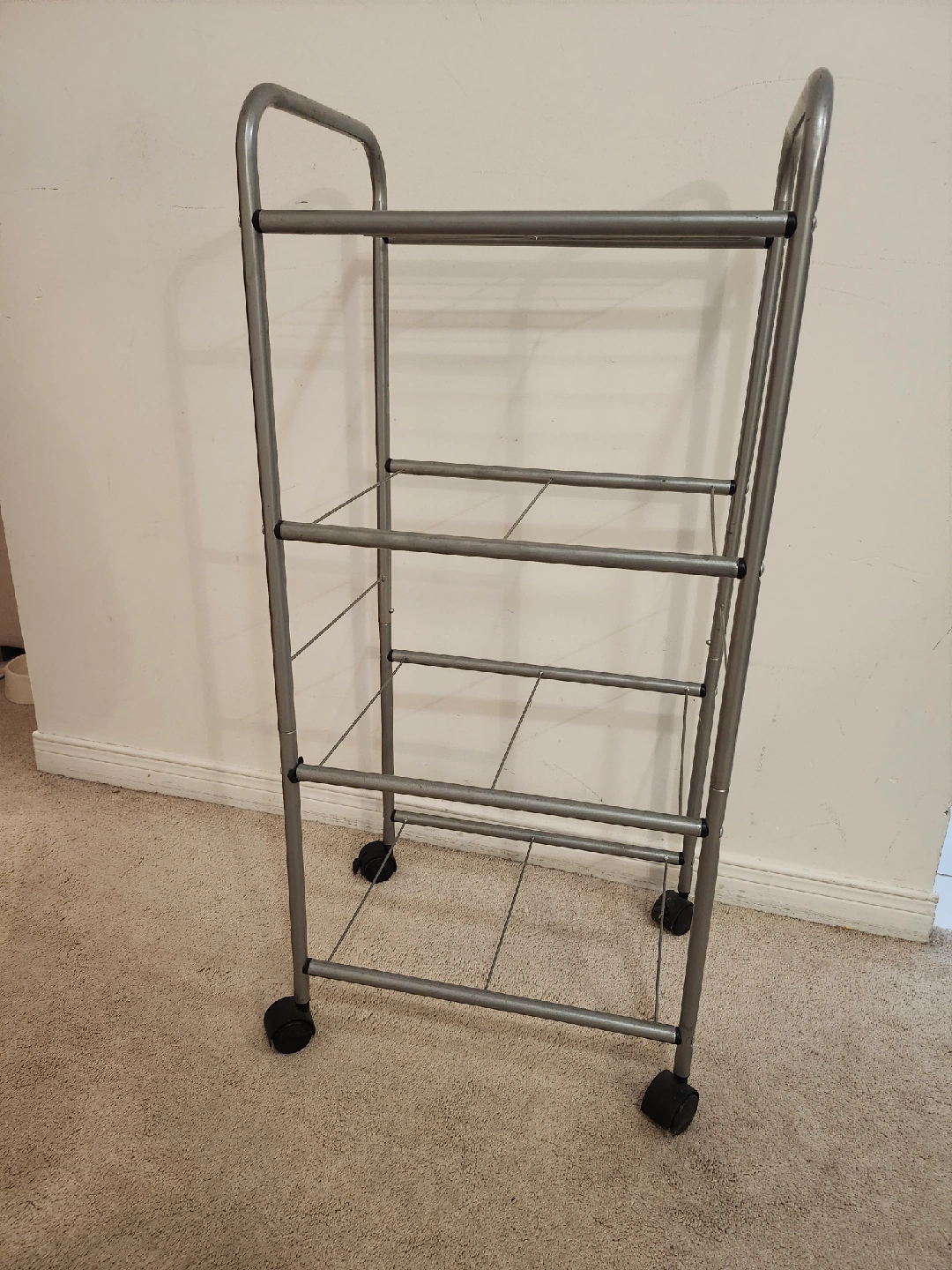 Here's a handy metal rolling cart, perfect for extra storage in a small space! It has four tiers and is easy to move around thanks to the wheels. Great for organizing items in your kitchen, bathroom, or craft room