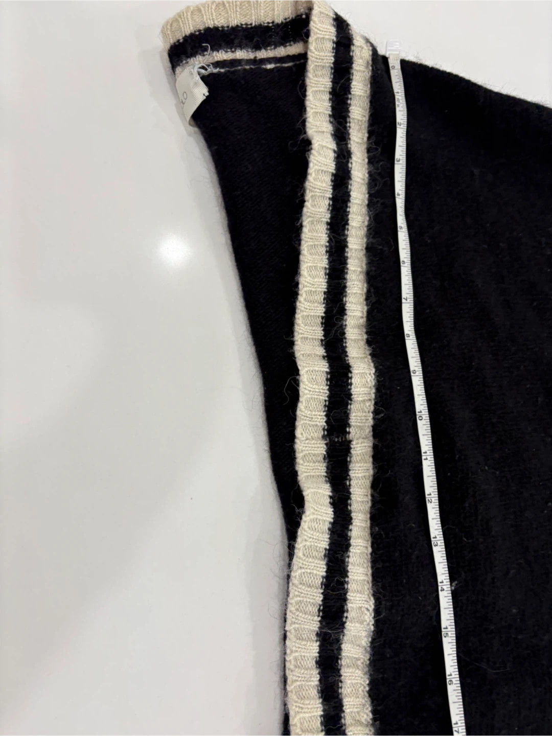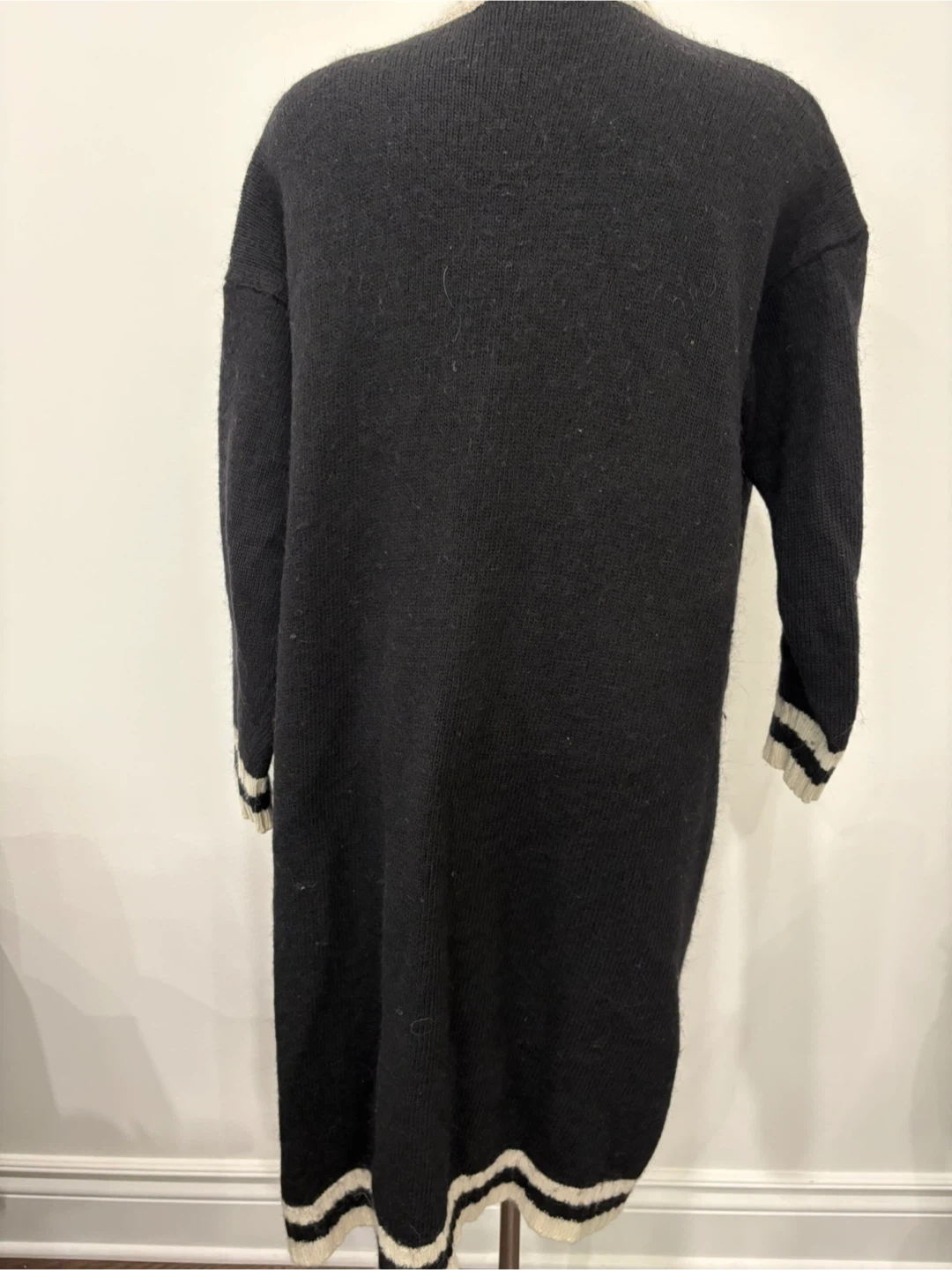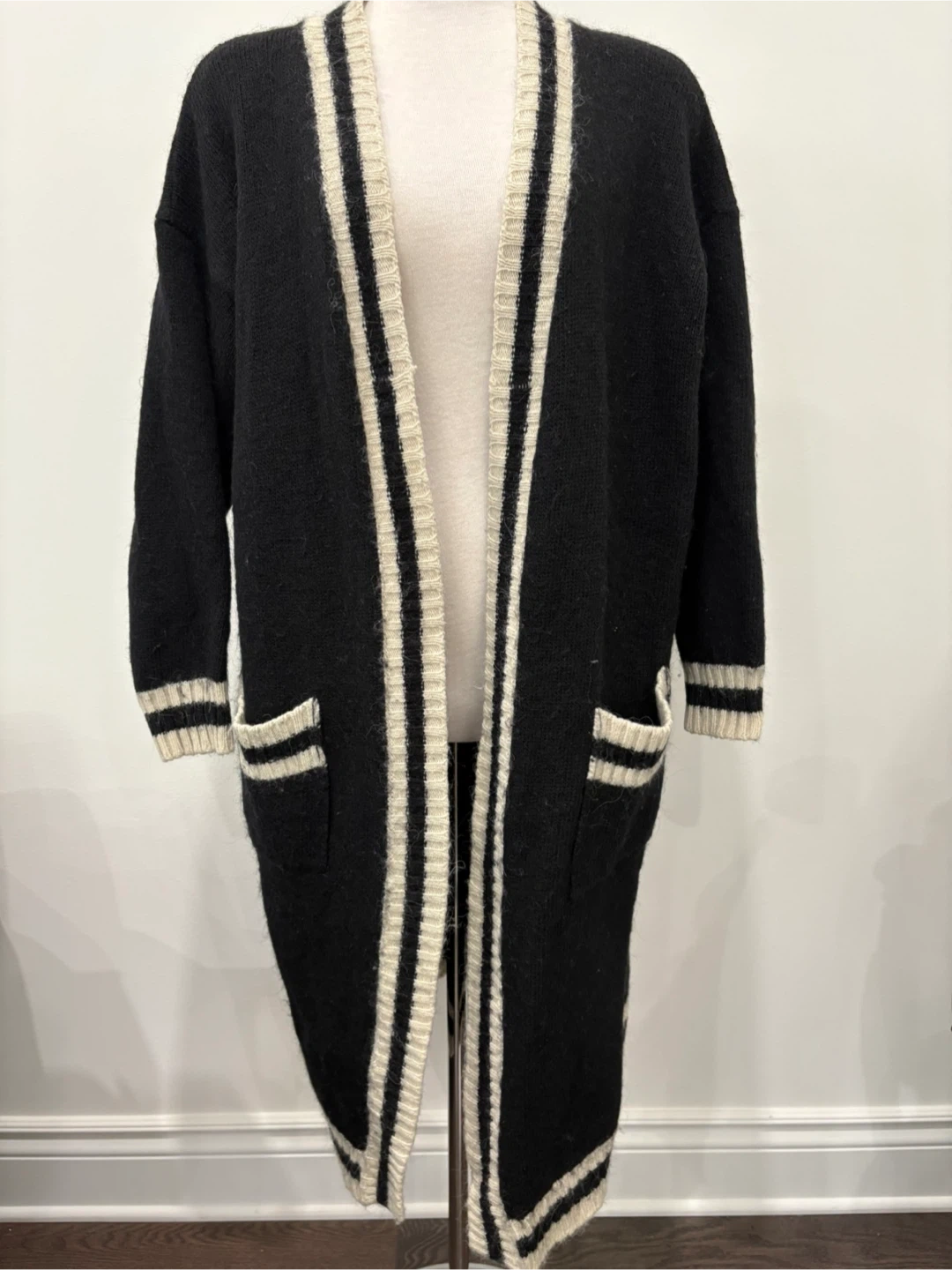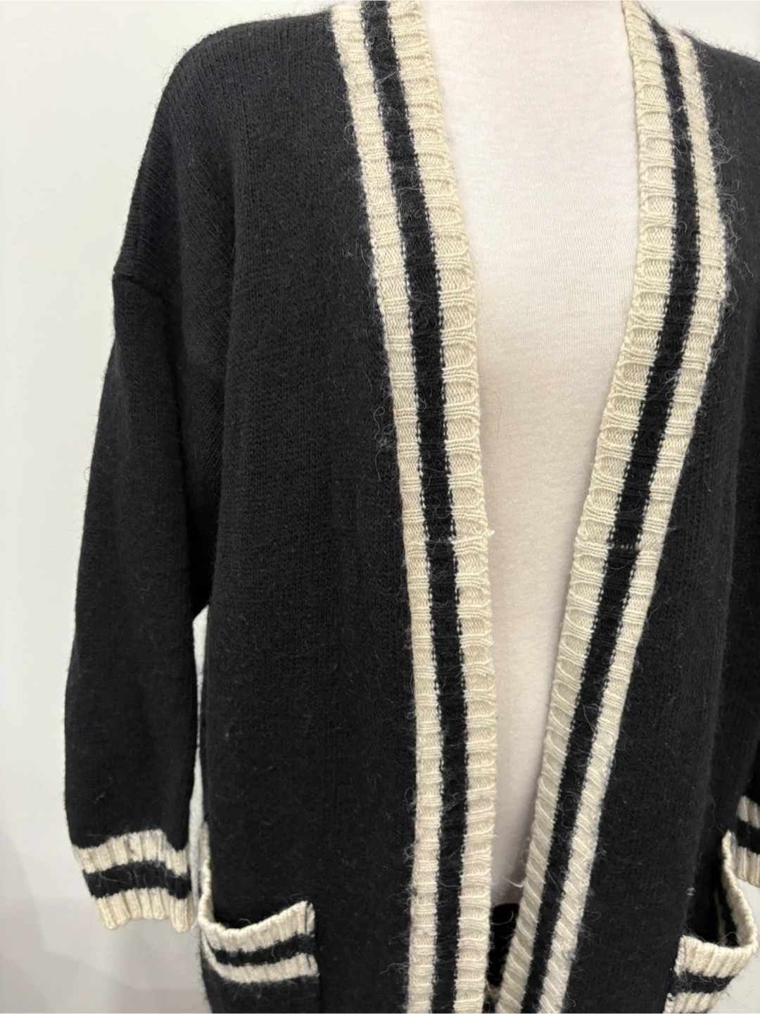 Here's a cozy VICOLO knit cardigan! It features a black body with white stripes along the front, pockets, and cuffs. It's perfect for layering during cooler weather